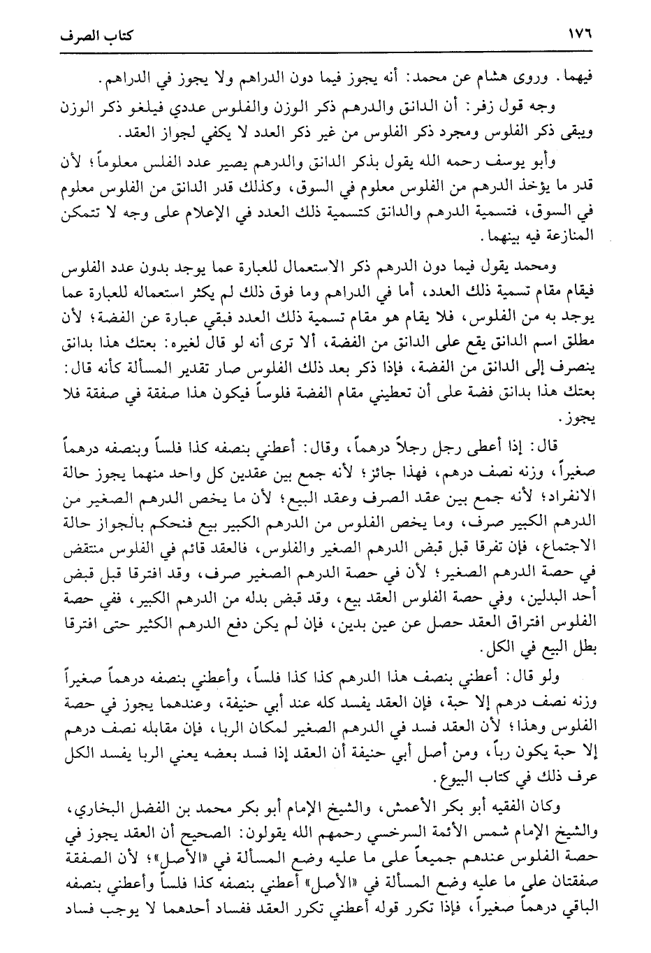 وكان الفقيه أبو بكر الأعمش، والشيخ الإمام أبو بكر محمد بن الفضل البخاري، والشيخ الإمام شمس الأئمة السرخسي رحمهم الله يقولون: الصحيح أن العقد يجوز في حصة الفلوس عندهم جميعاً على ما عليه وضع المسألة في «الأصل» ؛ لأن الصفقة صفقتان على ما عليه وضع المسألة في «الأصل» أعطني بنصفه كذا فلساً وأعطني بنصفه الباقي درهماً صغيراً، فإذا تكرر قوله أعطني تكرر العقد ففساد أحدهما لا يوجب فساد