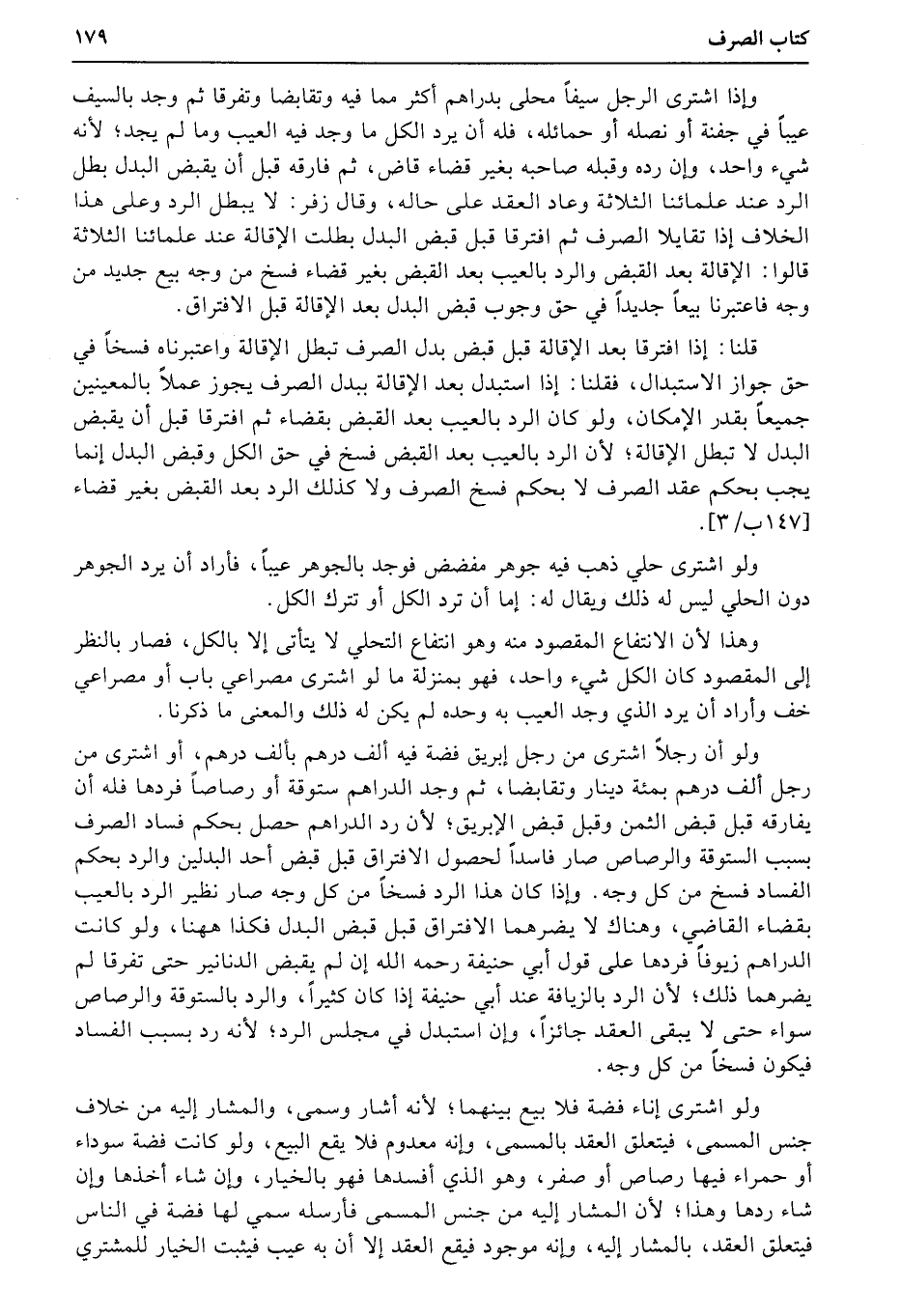 وإذا اشترى الرجل سيفاً محلى بدراهم أكثر مما فيه وتقابضا وتفرقا ثم وجد بالسيف عيباً في جفنة أو نصله أو حمائله، فله أن يرد الكل ما وجد فيه العيب وما لم يجد؛ لأنه شيء واحد، وإن رده وقبله صاحبه بغير قضاء قاض، ثم فارقه قبل أن يقبض البدل بطل الرد عند علمائنا الثلاثة وعاد العقد على حاله، وقال زفر: لا يبطل الرد وعلى هذا الخلاف إذا تقايلا الصرف ثم افترقا قبل قبض البدل بطلت الإقالة عند علمائنا الثلاثة قالوا: الإقالة بعد القبض والرد بالعيب بعد القبض بغير قضاء فسخ من وجه بيع جديد من وجه فاعتبرنا بيعاً جديداً في حق وجوب قبض البدل بعد الإقالة قبل الافتراق.