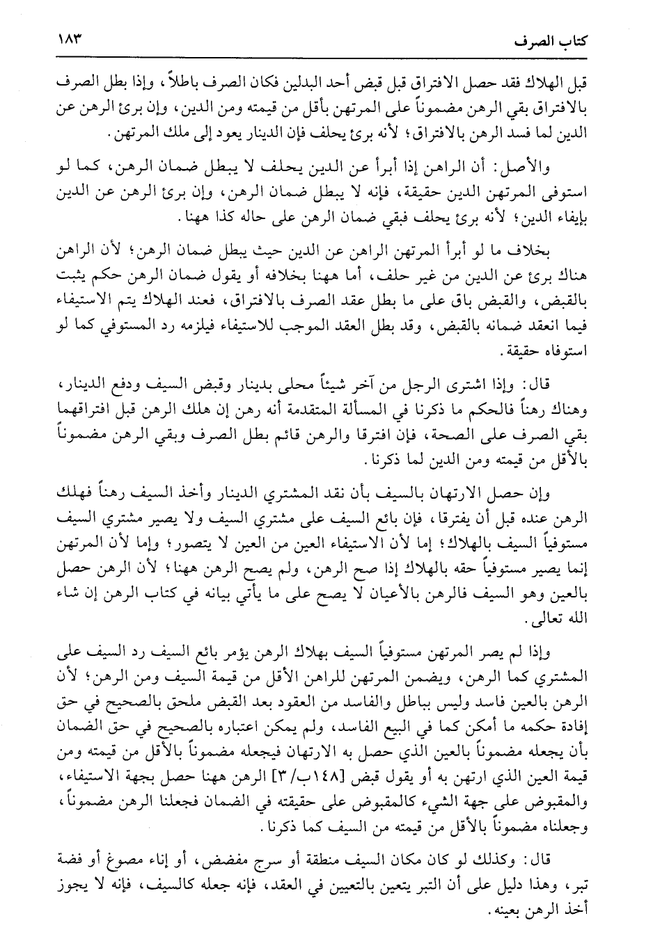 وإن حصل الارتهان بالسيف بأن نقد المشتري الدينار وأخذ السيف رهناً فهلك الرهن عنده قبل أن يفترقا، فإن بائع السيف على مشتري السيف ولا يصير مشتري السيف مستوفياً السيف بالهلاك؛ إما لأن الاستيفاء العين من العين لا يتصور؛ وإما لأن المرتهن إنما يصير مستوفياً حقه بالهلاك إذا صح الرهن، ولم يصح الرهن ههنا؛ لأن الرهن حصل بالعين وهو السيف فالرهن بالأعيان لا يصح على ما يأتي بيانه في كتاب الرهن إن شاء الله تعالى.