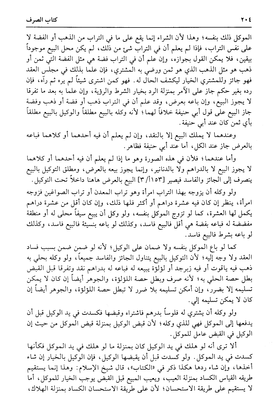الموكل ذلك بنفسه؛ وهذا لأن الشراء إنما يقع على ما في التراب من الذهب أو الفضة لا على نفس التراب، فإذا لم يعلم أن في التراب شئ من ذلك، لم يكن محل البيع موجوداً بيقين، فلا يمكن القول بجوازه، وإن علم أن في التراب فضة هي مثل الفضة التي ثمن أو ذهب هو مثل الذهب الذي هو ثمن ورضي به المشتري، فإن علما بذلك في مجلس العقد فهو جائز وللمشتري الخيار ليكشف الحال له.