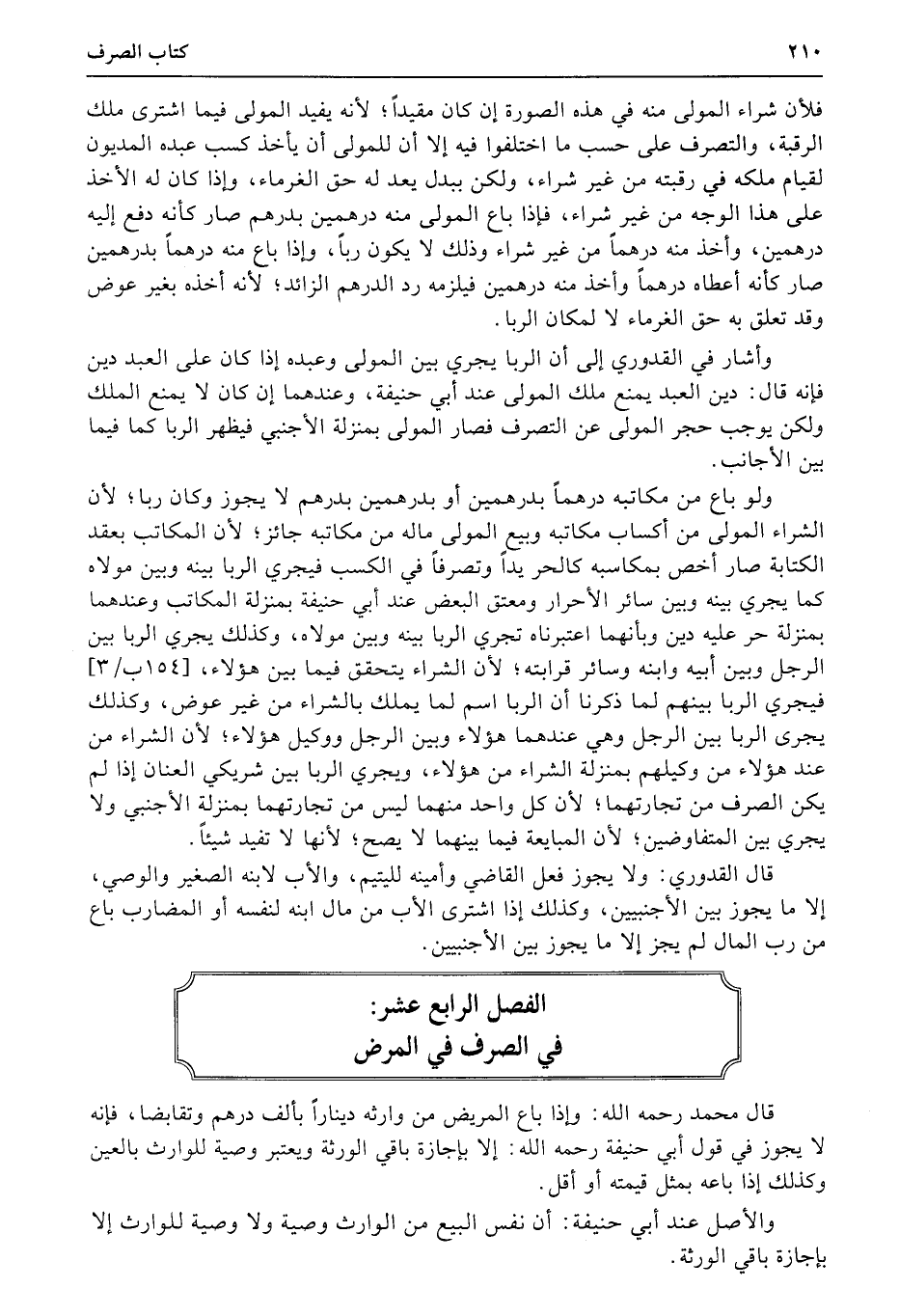 وأشار في القدوري إلى أن الربا يجري بين المولى وعبده إذا كان على العبد دين فإنه قال: دين العبد يمنع ملك المولى عند أبي حنيفة، وعندهما إن كان لا يمنع الملك ولكن يوجب حجر المولى عن التصرف فصار المولى بمنزلة الأجنبي فيظهر الربا كما فيما بين الأجانب.