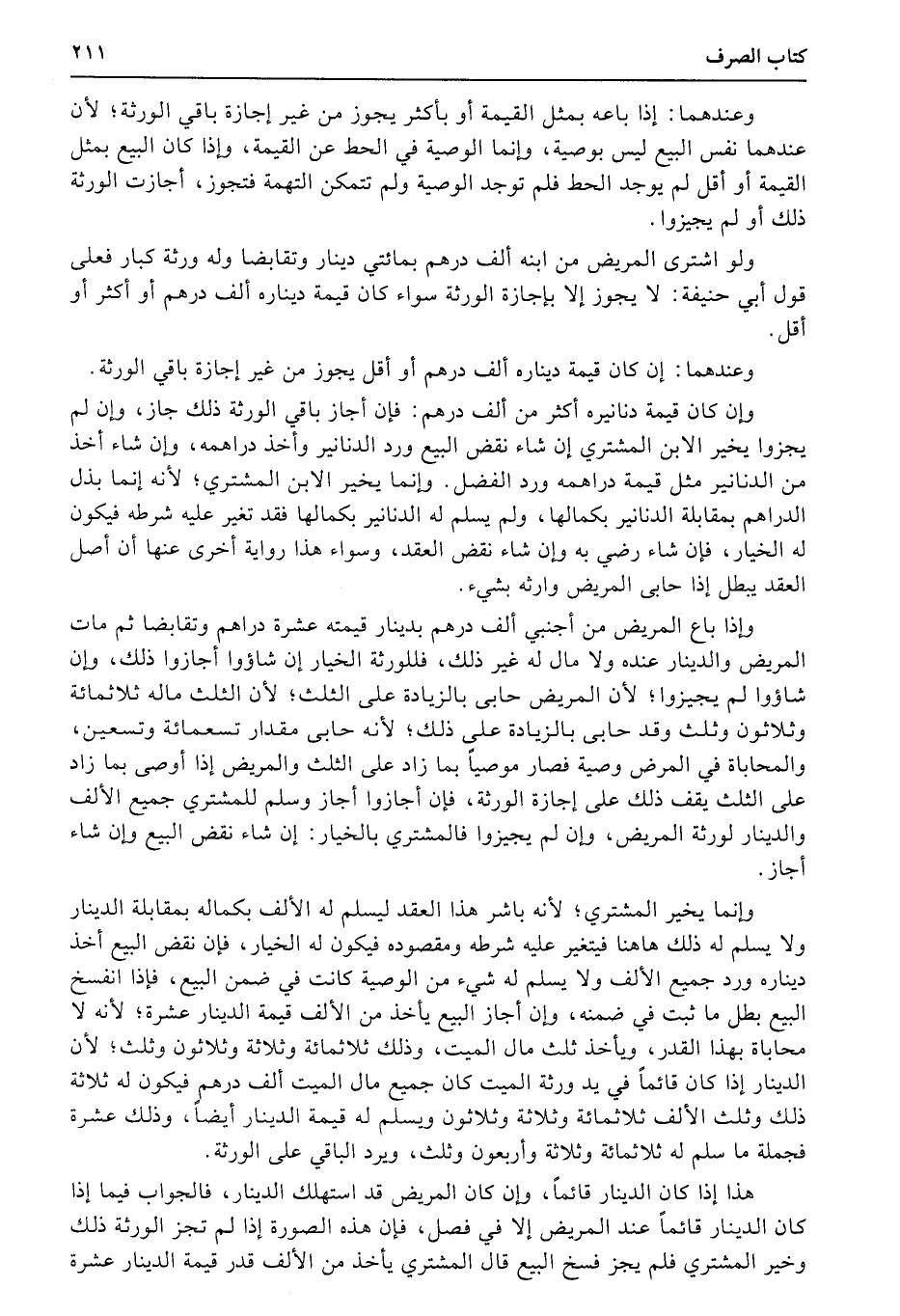 ولو اشترى المريض من ابنه ألف درهم بمائتي دينار وتقابضا وله ورثة كبار فعلى قول أبي حنيفة: لا يجوز إلا بإجازة الورثة سواء كان قيمة ديناره ألف درهم أو أكثر أو أقل.