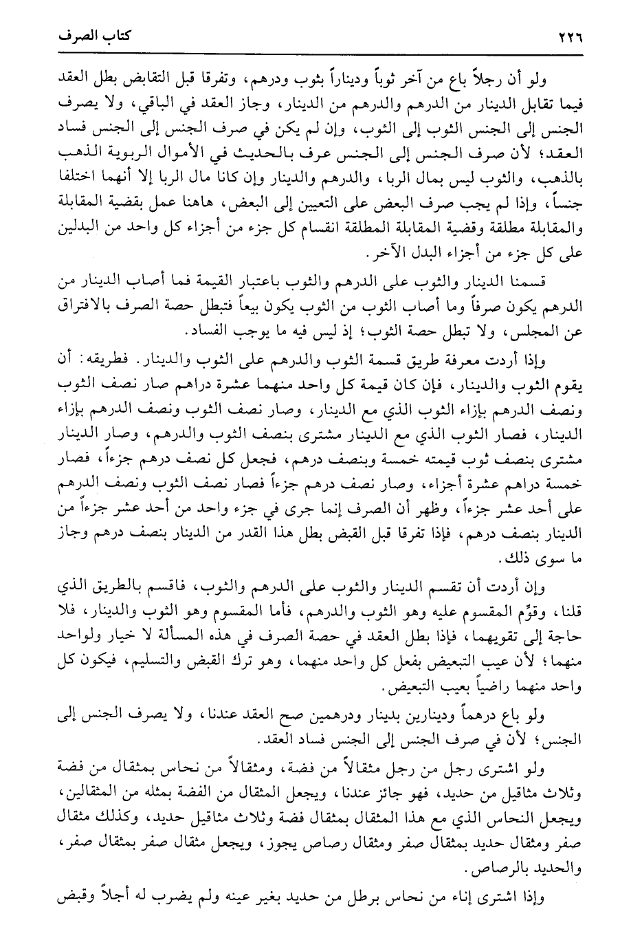 ولو أن رجلاً باع من آخر ثوباً وديناراً بثوب ودرهم، وتفرقا قبل التقابض بطل العقد فيما تقابل الدينار من الدرهم والدرهم من الدينار، وجاز العقد في الباقي، ولا يصرف الجنس إلى الجنس الثوب إلى الثوب، وإن لم يكن في صرف الجنس إلى الجنس فساد العقد؛ لأن صرف الجنس إلى الجنس عرف بالحديث في الأموال الربوية الذهب بالذهب، والثوب ليس بمال الربا، والدرهم والدينار وإن كانا مال الربا إلا أنهما اختلفا جنساً، وإذا لم يجب صرف البعض على التعيين إلى البعض، هاهنا عمل بقضية المقابلة والمقابلة مطلقة وقضية المقابلة المطلقة انقسام كل جزء من أجزاء كل واحد من البدلين على كل جزء من أجزاء البدل الآخر.