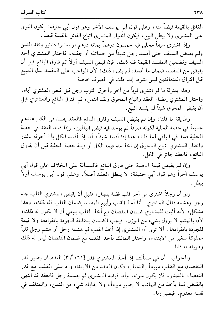 والجواب: أن في مسألتنا إذا أخذ المشتري قدر (161أ3) النقصان يصير قدر النقصان مع القلب مبيعاً بالدينار، فكان العقد من الابتداء ورد على القلب مع قدر النقصان بالدينار، فلا يكون سواء، وأما قبضه المشتري ثم يقسمة رجل فالعقد قد انتهى بالقبض فما يأخذ من الهاشم لا يصير مبيعاً، ولا يقابله شيء من الثمن، والمتلف في نفسه معدوم، فيصير ربا.