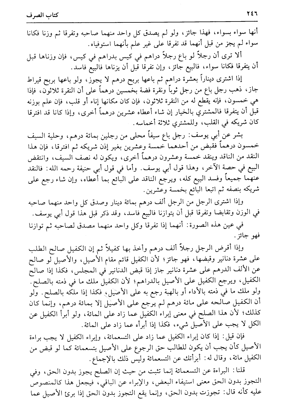 إذا اشترى ديناراً بعشرة دراهم ثم باعها بربح درهم لا يجوز، ولو باعها بربح قيراط جاز، ذهب رجل باع من رجل ثوباً ونقرة فضة بخمسين درهماً على أن النقرة ثلاثون، فإذا هي خمسون، فإنه يقطع له من النقرة ثلاثون، فإن كان مكانها إناء أو قلب، فإن علم بوزنه قبل أن يتفرقا فالمشتري بالخيار إن شاء أعطاه عشرين درهماً أخرى، وإذا كانا قد افترقا كان شريكه في القلب، وللمشتري ثلاثة أخماسه.