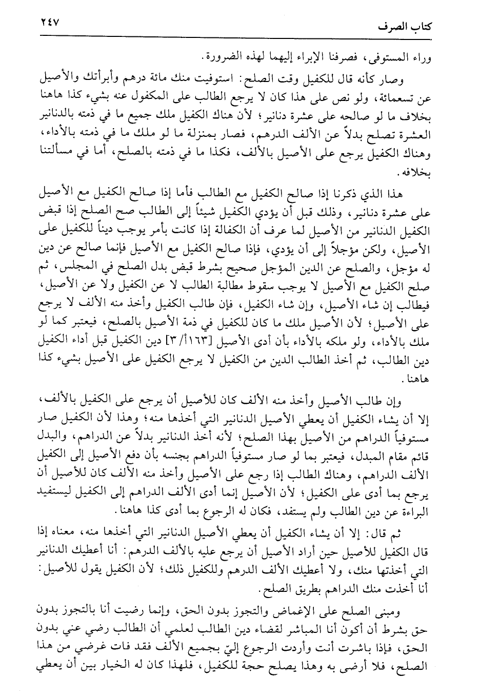 ومبنى الصلح على الإغماض والتجوز بدون الحق، وإنما رضيت أنا بالتجوز بدون حق بشرط أن أكون أنا المباشر لقضاء دين الطالب لعلمي أن الطالب رضي عني بدون الحق، فإذا باشرت أنت وأردت الرجوع إليّ بجميع الألف فقد فات غرضي من هذا الصلح، فلا أرضى به وهذا يصلح حجة للكفيل، فلهذا كان له الخيار بين أن يعطي