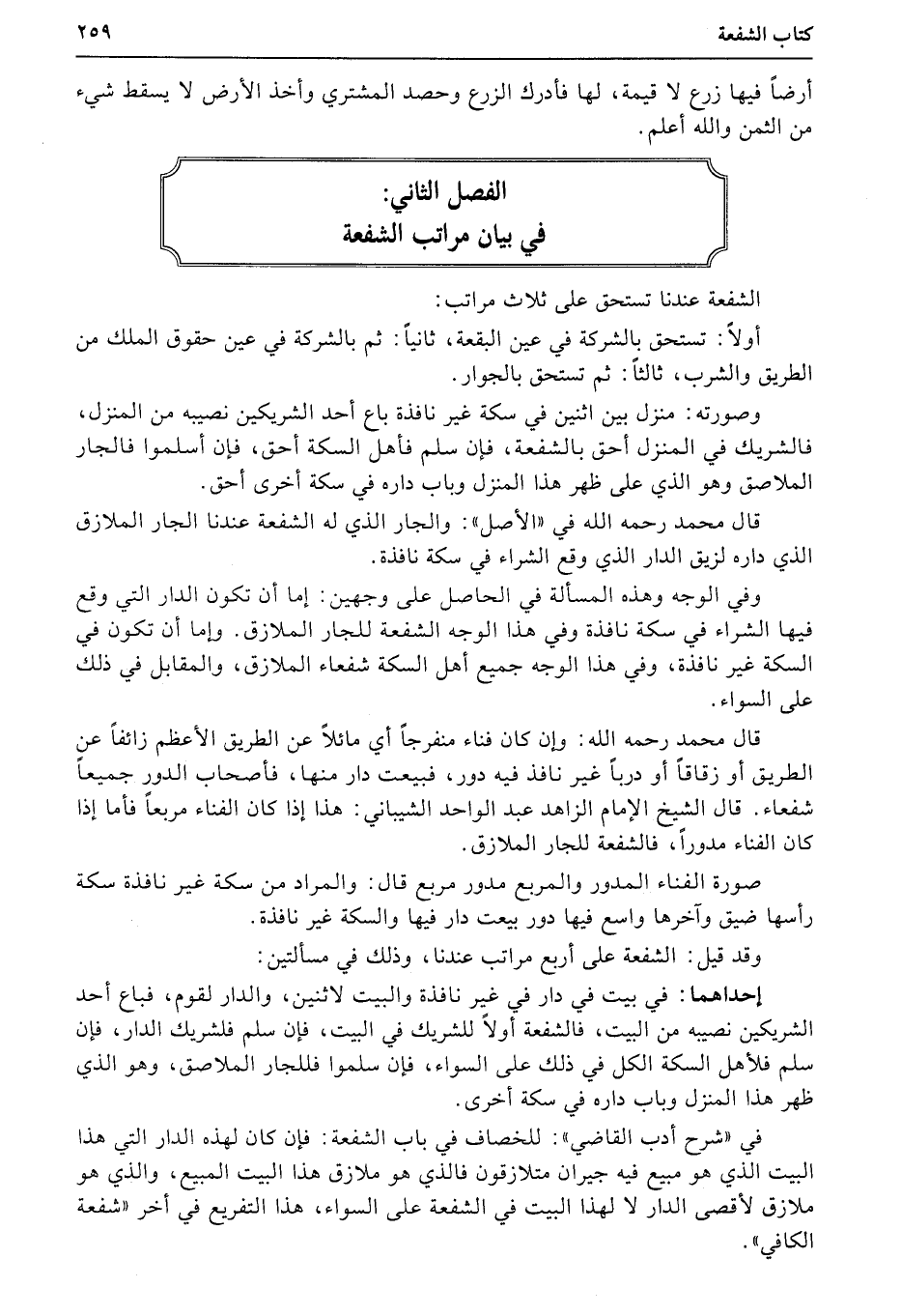 قال محمد رحمه الله: وإن كان فناء منفرجاً أي مائلاً عن الطريق الأعظم زائفاً عن الطريق أو زقاقاً أو درباً غير نافذ فيه دور، فبيعت دار منها، فأصحاب الدور جميعاً شفعاء. قال الشيخ الإمام الزاهد عبد الواحد الشيباني: هذا إذا كان الفناء مربعاً فأما إذا كان الفناء مدوراً، فالشفعة للجار الملازق.