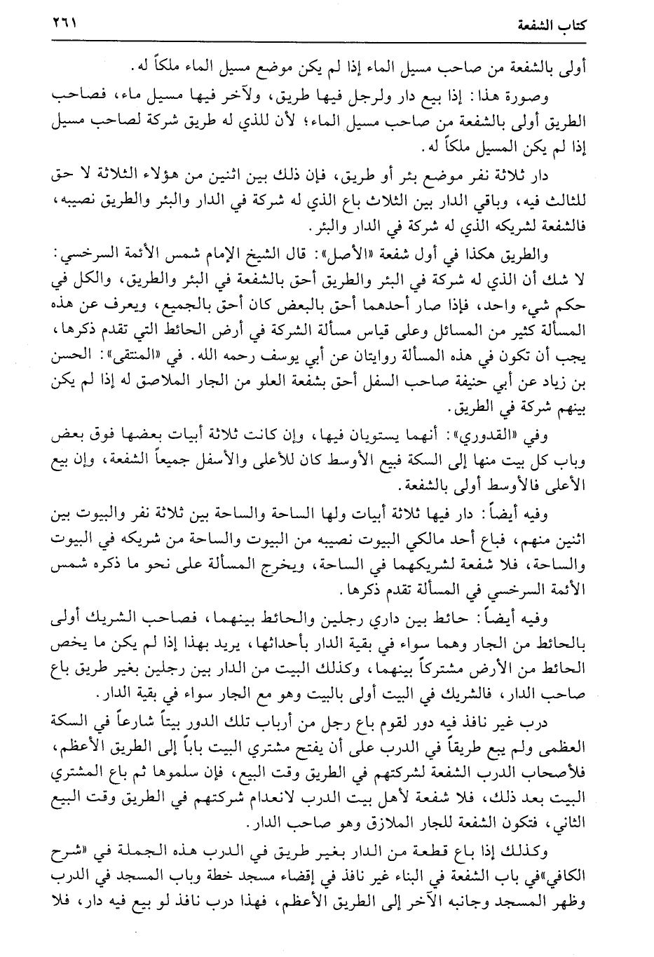 والطريق هكذا في أول شفعة «الأصل» : قال الشيخ الإمام شمس الأئمة السرخسي: لا شك أن الذي له شركة في البئر والطريق أحق بالشفعة في البئر والطريق، والكل في حكم شيء واحد، فإذا صار أحدهما أحق بالبعض كان أحق بالجميع، ويعرف عن هذه المسألة كثير من المسائل وعلى قياس مسألة الشركة في أرض الحائط التي تقدم ذكرها، يجب أن تكون في هذه المسألة روايتان عن أبي يوسف رحمه الله في «المنتقى» : الحسن بن زياد عن أبي حنيفة صاحب السفل أحق بشفعة العلو من الجار الملاصق له إذا لم يكن بينهم شركة في الطريق.