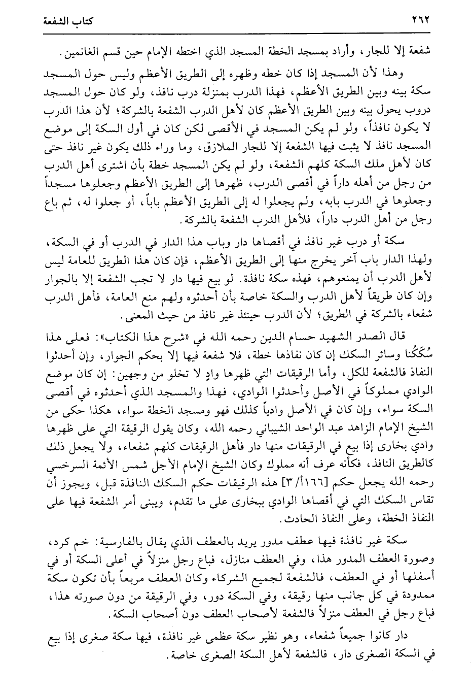 قال الصدر الشهيد حسام الدين رحمه الله في «شرح هذا الكتاب» : فعلى هذا سُكَكُنا وسائر السكك إن كان نفاذها خطة، فلا شفعة فيها إلا بحكم الجوار، وإن أحدثوا النفاذ فالشفعة للكل، وأما الرقيقات التي ظهرها وادٍ لا تخلو من وجهين: