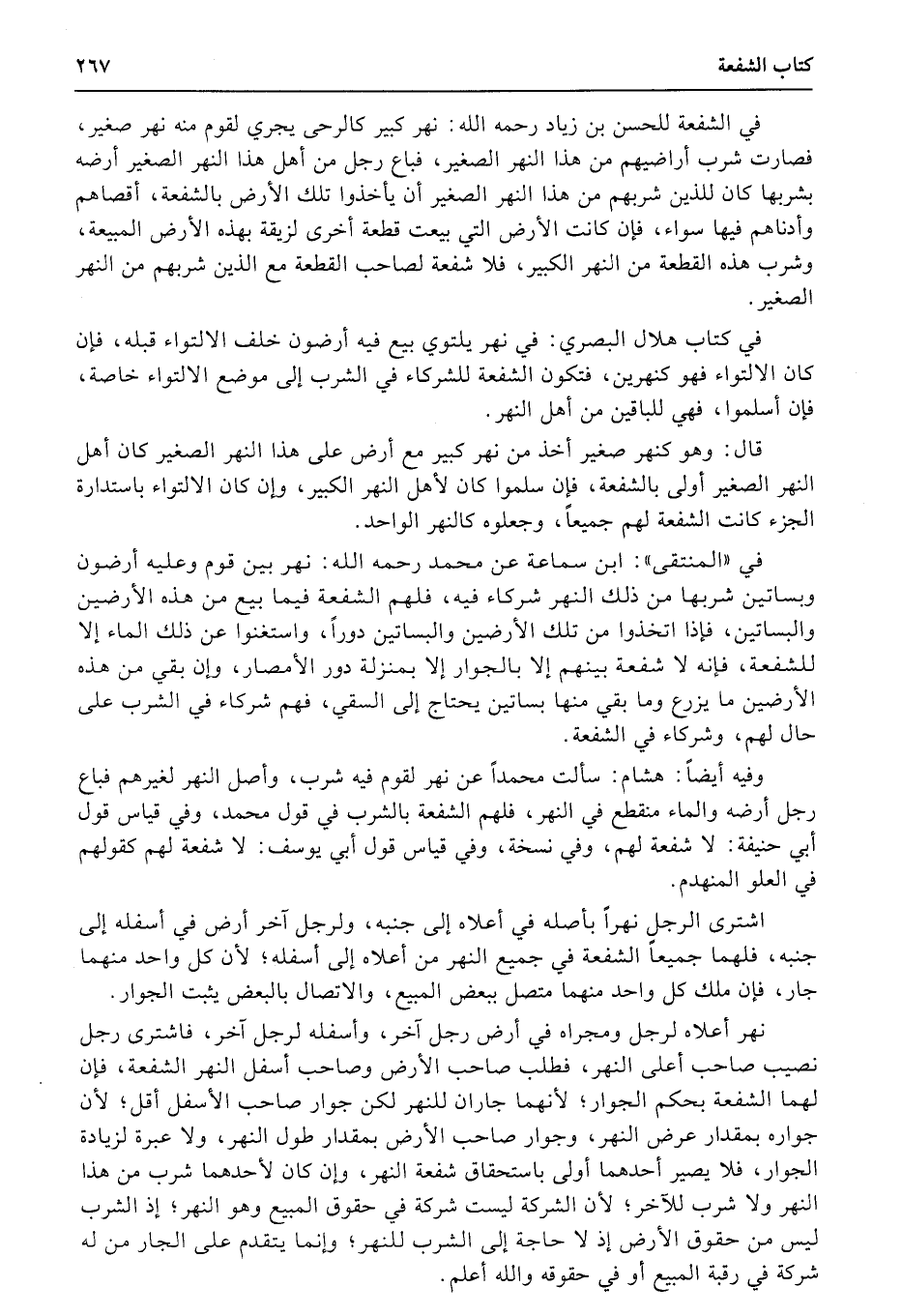 في الشفعة للحسن بن زياد رحمه الله: نهر كبير كالرحى يجري لقوم منه نهر صغير، فصارت شرب أراضيهم من هذا النهر الصغير، فباع رجل من أهل هذا النهر الصغير أرضه بشربها كان للذين شربهم من هذا النهر الصغير أن يأخذوا تلك الأرض بالشفعة، أقصاهم وأدناهم فيها سواء، فإن كانت الأرض التي بيعت قطعة أخرى لزيقة بهذه الأرض المبيعة، وشرب هذه القطعة من النهر الكبير، فلا شفعة لصاحب القطعة مع الذين شربهم من النهر الصغير.