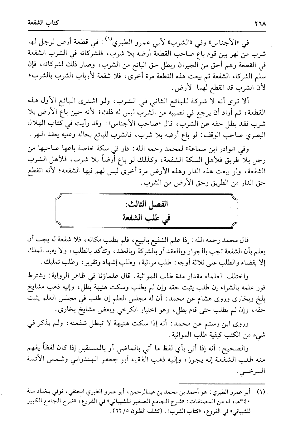 في «الأجناس» وفي «الشرب» لأبي عمرو الطبري: في قطعة أرض لرجل لها شرب من نهر بين قوم باع صاحب القطعة أرضه بلا شرب، فلشركائه في الشرب الشفعة في القطعة وهم أحق من الجيران وبطل حق البائع من الشرب، وصار ذلك لشركائه، فإن سلم الشركاء الشفعة ثم بيعت هذه القطعة مرة أخرى، فلا شفعة لأرباب الشرب بالشرب؛ لأن الشرب قد انقطع لهما الأرض.