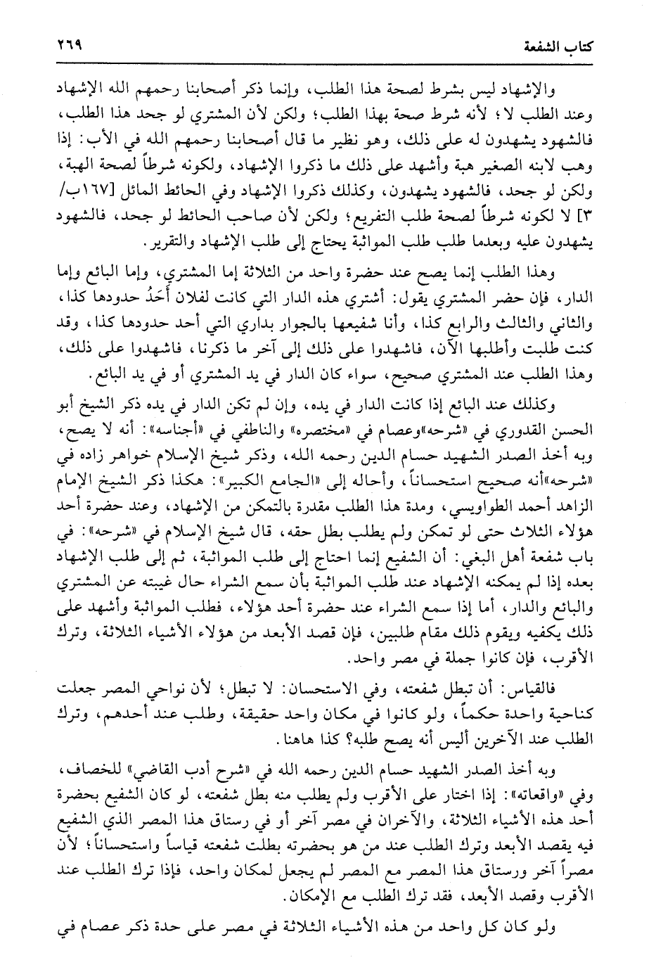 وبه أخذ الصدر الشهيد حسام الدين رحمه الله في «شرح أدب القاضي» للخصاف، وفي «واقعاته» : إذا اختار على الأقرب ولم يطلب منه بطل شفعته، لو كان الشفيع بحضرة أحد هذه الأشياء الثلاثة، والآخران في مصر آخر أو في رستاق هذا المصر الذي الشفيع فيه يقصد الأبعد وترك الطلب عند من هو بحضرته بطلت شفعته قياساً واستحساناً؛ لأن مصراً آخر ورستاق هذا المصر مع المصر لم يجعل لمكان واحد، فإذا ترك الطلب عند الأقرب وقصد الأبعد، فقد ترك الطلب مع الإمكان.