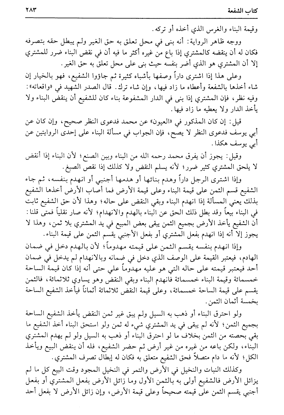 وإذا اشترى الرجل داراً وهدم بنائها أو هدمها أجنبي أو انهدم بنفسه، ثم جاء الشفيع قسم الثمن على قيمة البناء وعلى قيمة الأرض فما أصاب الأرض أخذها الشفيع بذلك يعني المسألة إذا انهدم البناء وبقي النقض على حاله؛ وهذا لأن حق الشفيع ثابت في البناء بيعاً وقد بطل ذلك الحق عن البناء بالهدم والانهدام؛ لأنه صار نقلياً فمتى قلنا: أن الشفيع يأخذ الأرض بجميع الثمن يبقى بعض المبيع في يد المشتري بلا ثمن، وهذا لا يجوز إلا أنه إذا انهدم بفعل المشتري أو بفعل الأجنبي يقسم الثمن على قيمة البناء.