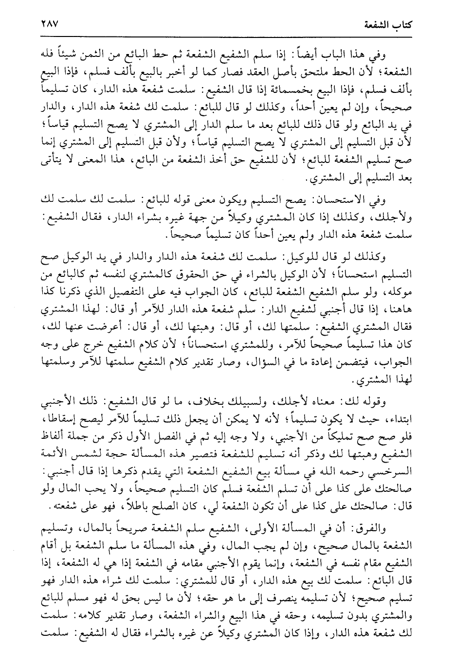 وفي الاستحسان: يصح التسليم ويكون معنى قوله للبائع: سلمت لك سلمت لك ولأجلك، وكذلك إذا كان المشتري وكيلاً من جهة غيره بشراء الدار، فقال الشفيع: سلمت شفعة هذه الدار ولم يعين أحداً كان تسليماً صحيحاً.