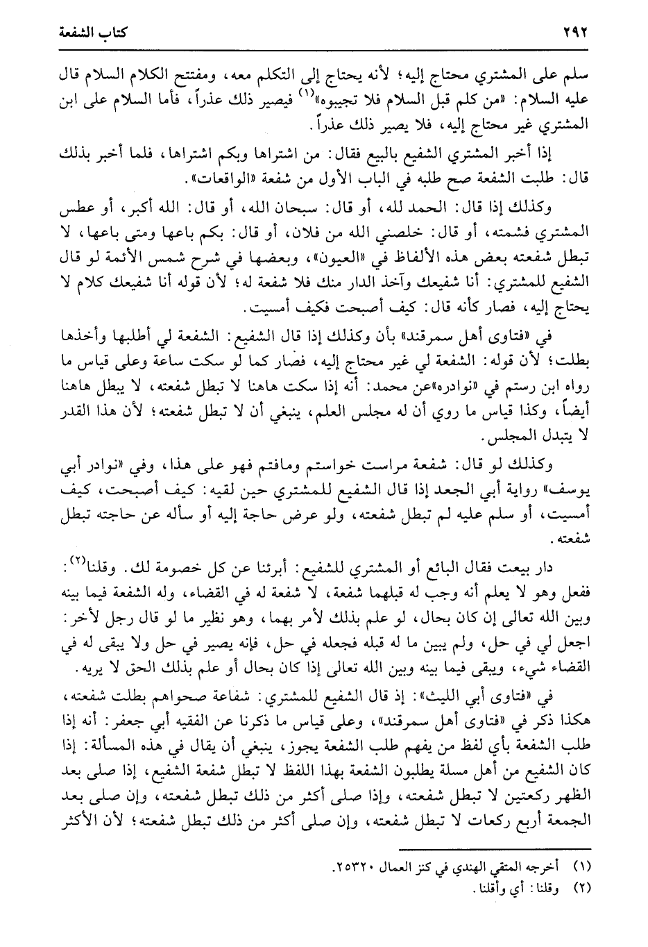 في «فتاوى أبي الليث» : إذ قال الشفيع للمشتري: شفاعة صحواهم بطلت شفعته، هكذا ذكر في «فتاوى أهل سمرقند» ، وعلى قياس ما ذكرنا عن الفقيه أبي جعفر: أنه إذا طلب الشفعة بأي لفظ من يفهم طلب الشفعة يجوز، ينبغي أن يقال في هذه المسألة: إذا كان الشفيع من أهل مسلة يطلبون الشفعة بهذا اللفظ لا تبطل شفعة الشفيع، إذا صلى بعد الظهر ركعتين لا تبطل شفعته، وإذا صلى أكثر من ذلك تبطل شفعته، وإن صلى بعد الجمعة أربع ركعات لا تبطل شفعته، وإن صلى أكثر من ذلك تبطل شفعته؛ لأن الأكثر
