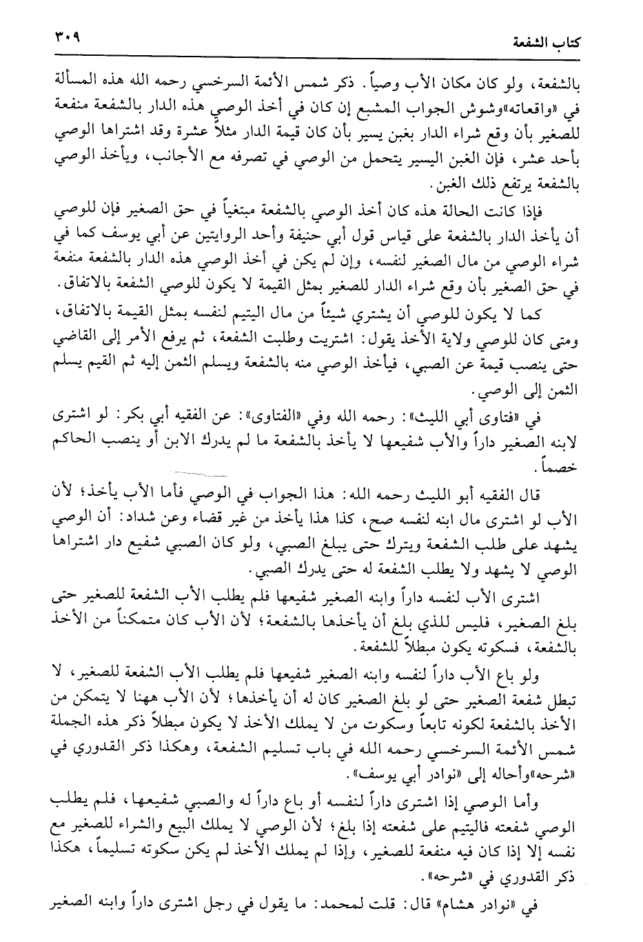 بالشفعة، ولو كان مكان الأب وصياً. ذكر شمس الأئمة السرخسي رحمه الله هذه المسألة في «واقعاته» وشوش الجواب المشبع إن كان في أخذ الوصي هذه الدار بالشفعة منفعة للصغير بأن وقع شراء الدار بغبن يسير بأن كان قيمة الدار مثلاً عشرة وقد اشتراها الوصي بأحد عشر، فإن الغبن اليسير يتحمل من الوصي في تصرفه مع الأجانب، ويأخذ الوصي بالشفعة يرتفع ذلك الغبن.