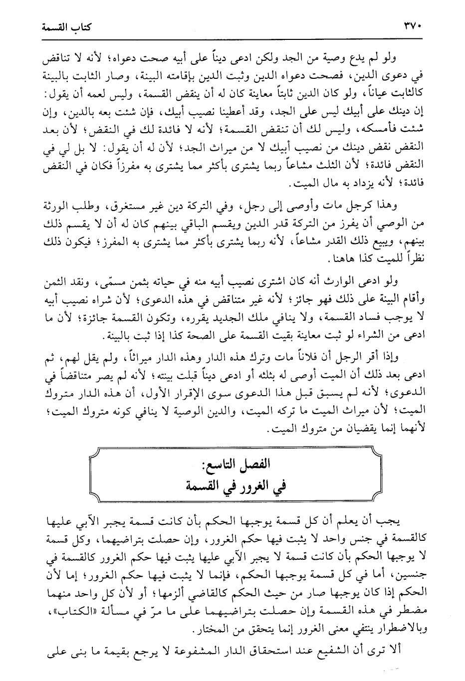 يجب أن يعلم أن كل قسمة يوجبها الحكم بأن كانت قسمة يجبر الآبي عليها كالقسمة في جنس واحد لا يثبت فيها حكم الغرور، وإن حصلت بتراضيهما، وكل قسمة لا يوجبها الحكم بأن كانت قسمة لا يجبر الآبي عليها يثبت فيها حكم الغرور كالقسمة في جنسين، أما في كل قسمة يوجبها الحكم، فإنما لا يثبت فيها حكم الغرور؛ إما لأن الحكم إذا كان يوجبها صار من حيث الحكم كالقاضي ألزمها؛ أو لأن كل واحد منهما مضطر في هذه القسمة وإن حصلت بتراضيهما على ما مرّ في مسألة «الكتاب» ، وبالاضطرار ينتفي معنى الغرور إنما يتحقق من المختار.