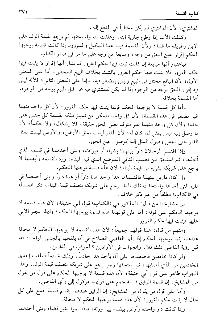 وأما كل قسمة لا يوجبها الحكم فإنما يثبت فيها حكم الغرور؛ لأن كل واحد منهما غير مضطر في هذه القسمة؛ لأن واحد متمكن من تمييز ملكه بقسمة كل جنس على حده؛ ولأن كل واحد منهما غير متوف لعين الحق حقيقة، فلا إشكال، ولا حكماً؛ لأن ما وصل إليه ليس بمثل لما كان له؛ لأن الدار ليست بمثل الأرض، والأرض ليست بمثل الدار حتى يجعل وصول المثل إليه كوصول عين الحق.