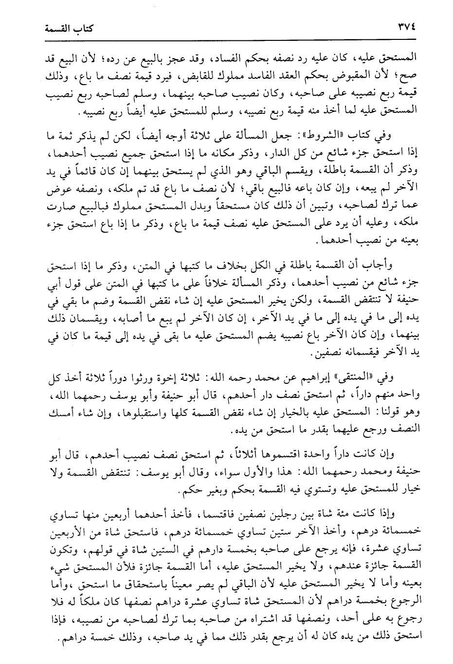 وأجاب أن القسمة باطلة في الكل بخلاف ما كتبها في المتن، وذكر ما إذا استحق جزء شائع من نصيب أحدهما، وذكر المسألة خلافاً على ما كتبها في المتن على قول أبي حنيفة لا تنتقض القسمة، ولكن يخير المستحق عليه إن شاء نقض القسمة وضم ما بقي في يده إلى ما في يده إلى ما في يد الآخر، إن كان الآخر لم يبع ما أصابه، ويقسمان ذلك بينهما، وإن كان الآخر باع نصيبه يضم المستحق عليه ما بقى في يده إلى قيمة ما كان في يد الآخر فيقسمانه نصفين.