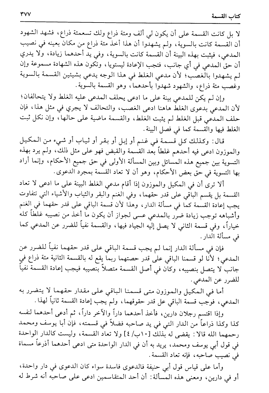 ألا ترى أن في المكيل والموزون إذا أقام مدعي الغلط البينة على ما ادعى لا تعال القسمة بل يقسم الباقي على قدر حقهما، وفي الغنم والبقر والثياب والأشياء التي تتفاوت يجب إعادة القسمة كما في مسألة الدار، وهذا لأن قسمة الباقي على قدر حقهما في الغنم وأشباهه توجب زيادة ضرر بالمدعي عسى لجواز أن يكون ما أخذ من نصيبه غلطاً كله خياراً، وفي قسمة الثاني لا يصل إليه الجياد فيها، والقسمة نفياً للضرر عن المدعي كما في مسألة الدار.