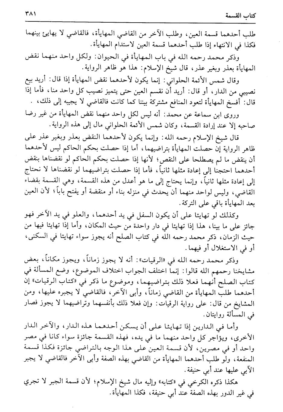 هكذا ذكره الكرخي في «كتابه» وإليه مال شيخ الإسلام؛ لأن قسمة الجبر لا تجري في غير الدور بهذه الصفة عند أبي حنيفة، فكذا المهايأة.