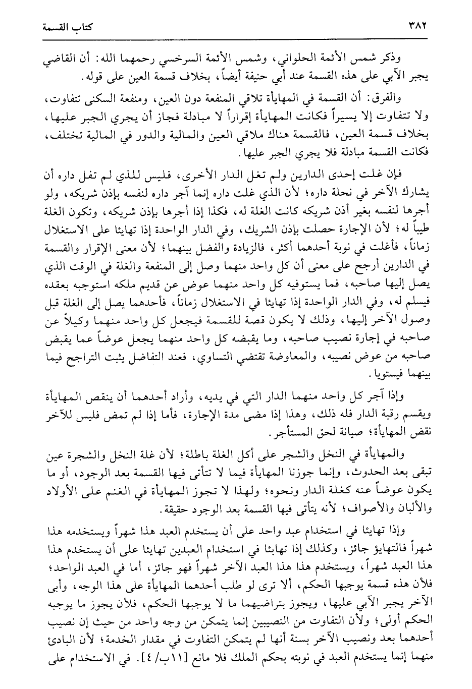 وذكر شمس الأئمة الحلواني، وشمس الأئمة السرخسي رحمهما الله: أن القاضي يجبر الآبي على هذه القسمة عند أبي حنيفة أيضاً، بخلاف قسمة العين على قوله.