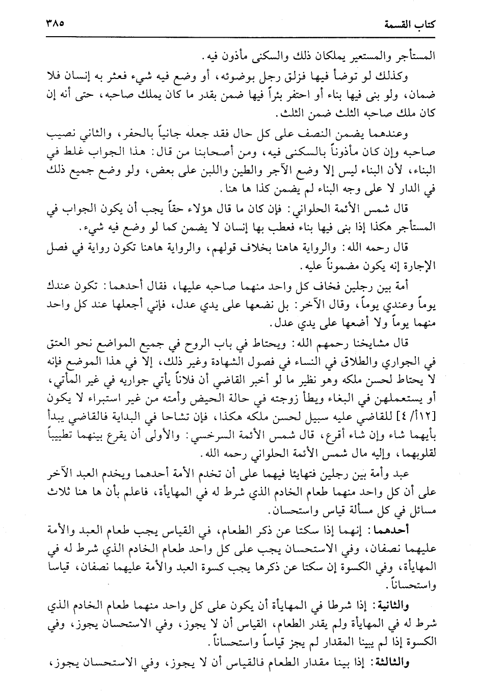 عبد وأمة بين رجلين فتهايئا فيهما على أن تخدم الأمة أحد هما ويخدم العبد الآخر على أن كل واحد منهما طعام الخادم الذي شرط له في المهايأة، فاعلم بأن ها هنا ثلاث مسائل في كل مسألة قياس واستحسان.