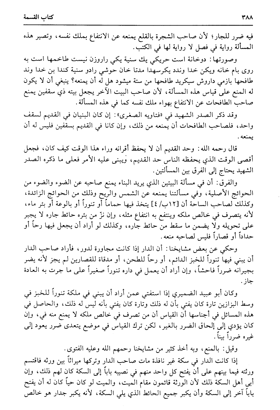 والفرق: أن في مسألة البيتين الذي يريد البناء يمنع صاحبه عن الضوء والضوء من الحوائج الأصلية، وفي مسألتنا يمنعه عن الشمس والريح وذلك من الحوائج الزائدة، وكذلك لصاحب الساحة أن (12ب4) يتخذ فيها حماماً أو تنوراً أو بالوعة أو بئر ماء، لأنه يتصرف في خالص ملكه وينتفع به انتفاع مثله، وإن نزّمن بئره حائط جاره لا يجبر على تحويله ولا يضمن ما سقط من حائط جاره، وكذلك لو أراد أن يجعل فيها رحاً أو حداداً أو قصاراً فليس لصاحبه منعه.