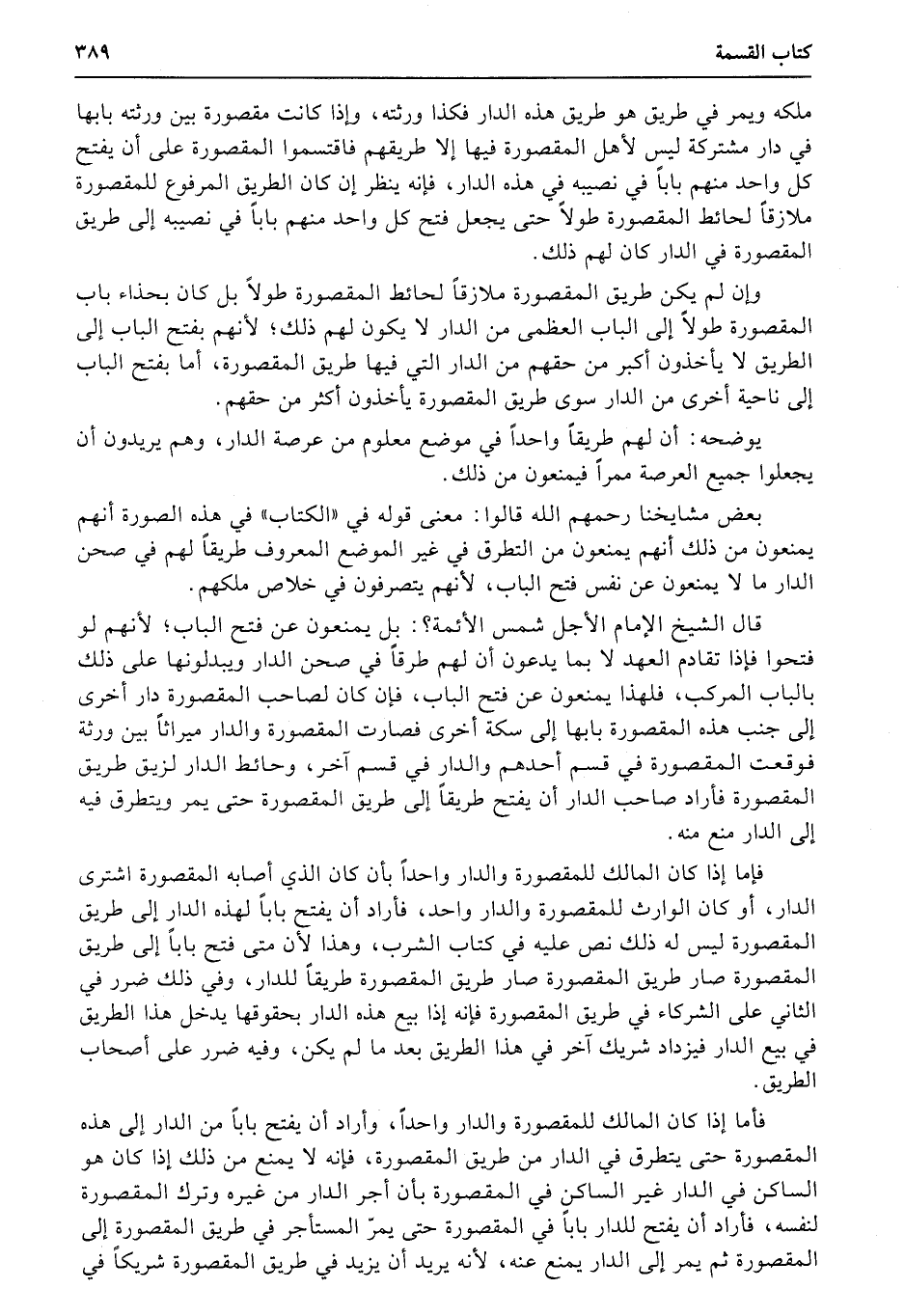 وإن لم يكن طريق المقصورة ملازقاً لحائط المقصورة طولاً بل كان بحذاء باب المقصورة طولاً إلى الباب العظمى من الدار لا يكون لهم ذلك؛ لأنهم بفتح الباب إلى الطريق لا يأخذون أكبر من حقهم من الدار التي فيها طريق المقصورة، أما بفتح الباب إلى ناحية أخرى من الدار سوى طريق المقصورة يأخذون أكثر من حقهم.