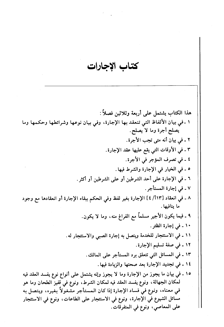 15 * في بيان ما يجوز من الإجارة وما لا يجوز وإنه يشتمل على أنواع نوع يفسد العقد فيه لمكان الجهالة، ونوع يفسد العقد فيه لمكان الشرط، ونوع في قفيز الطحان وما هو في معناه، ونوع في فساد الإجارة إذا كان المستأجر مشغولاً بغيره، ويتصل به مسائل الشيوع في الإجارة، ونوع في الاستئجار على الطاعات، ونوع في الاستئجار على المعاصي، ونوع في المتفرقات.