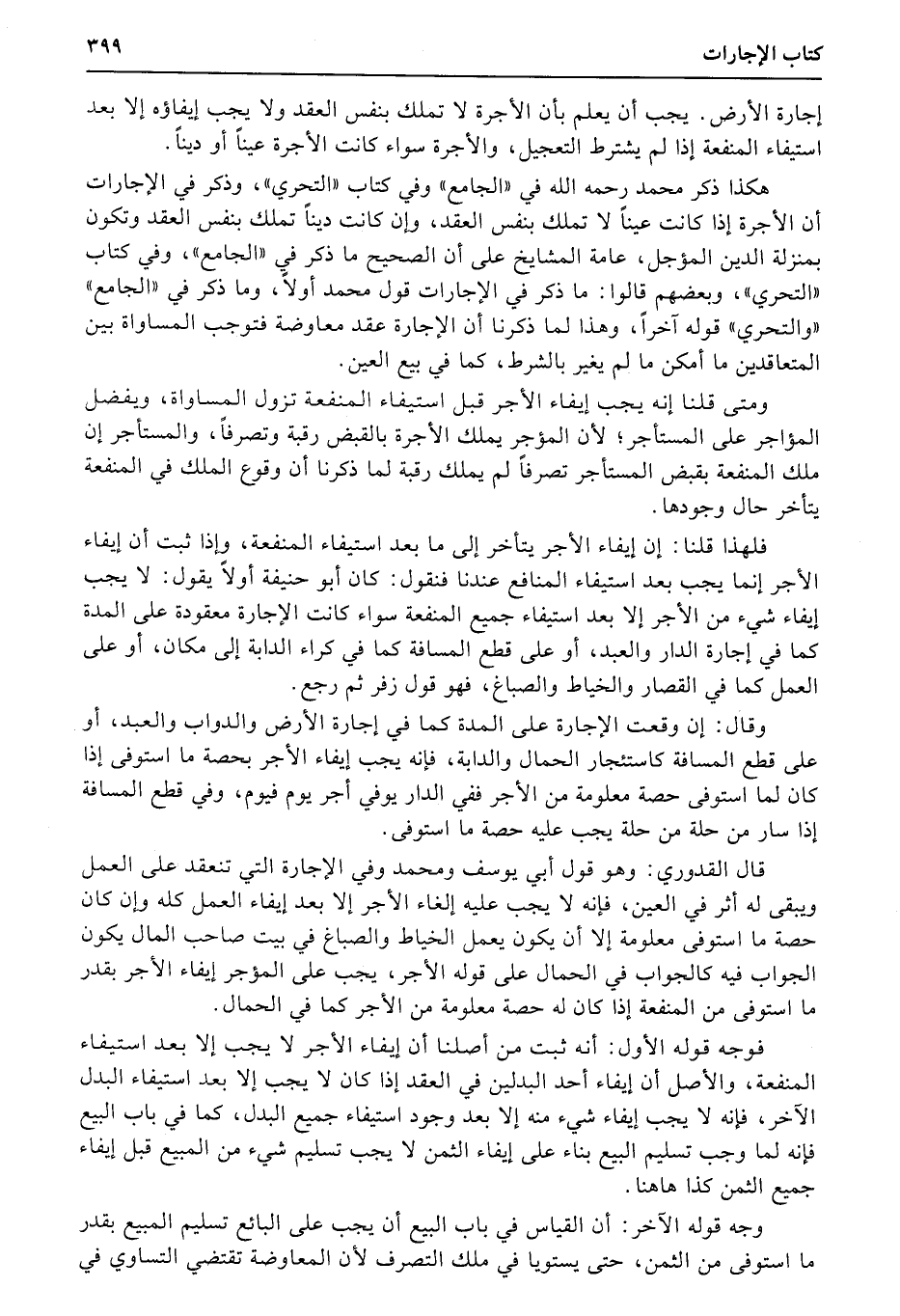 فلهذا قلنا: إن إيفاء الأجر يتأخر إلى ما بعد استيفاء المنفعة، وإذا ثبت أن إيفاء الأجر إنما يجب بعد استيفاء المنافع عندنا فنقول: كان أبو حنيفة أولاً يقول: لا يجب إيفاء شيء من الأجر إلا بعد استيفاء جميع المنفعة سواء كانت الإجارة معقودة على المدة كما في إجارة الدار والعبد، أو على قطع المسافة كما في كراء الدابة إلى مكان، أو على العمل كما في القصار والخياط والصباغ، فهو قول زفر ثم رجع.