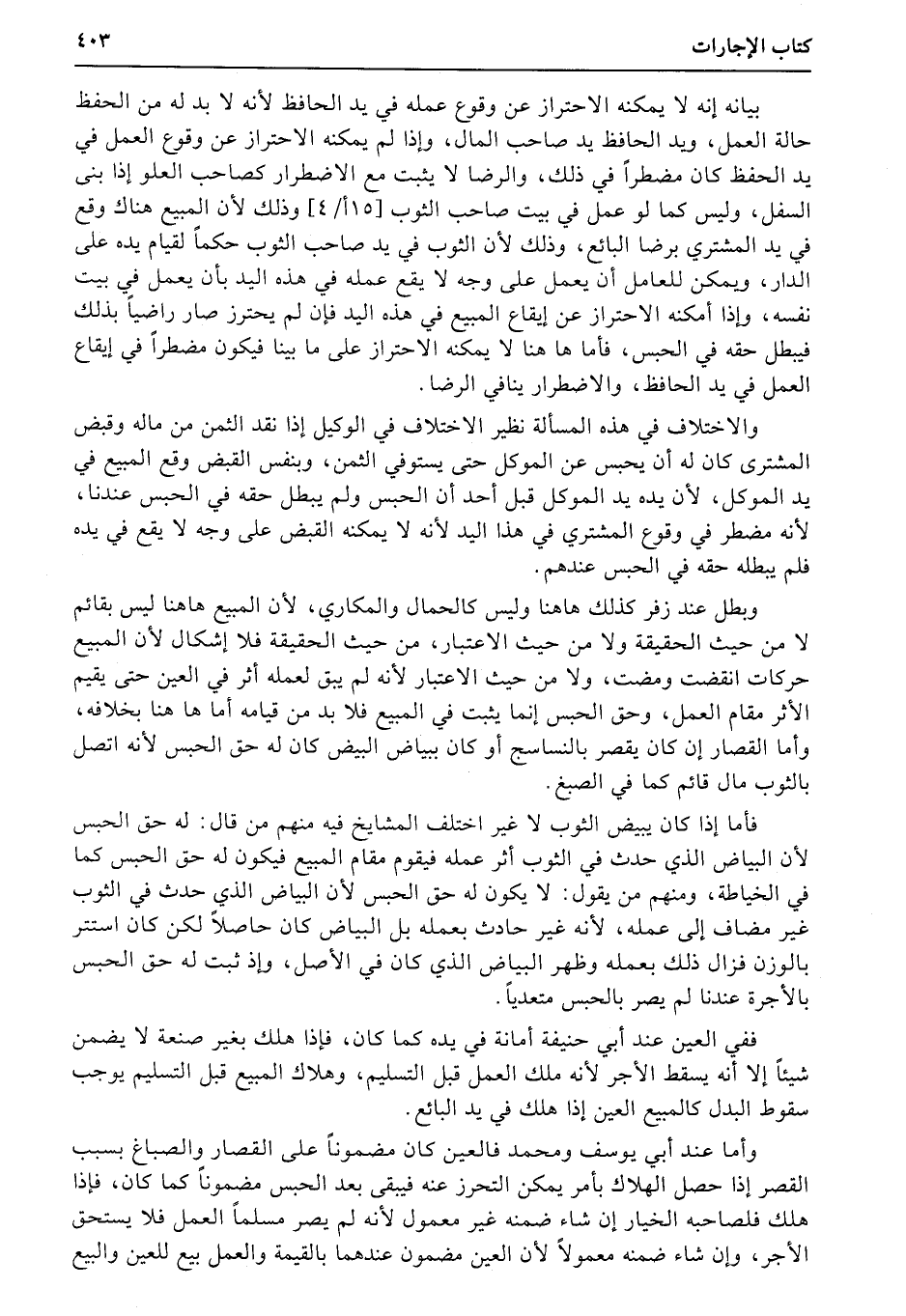فأما إذا كان يبيض الثوب لا غير اختلف المشايخ فيه منهم من قال: له حق الحبس لأن البياض الذي حدث في الثوب أثر عمله فيقوم مقام المبيع فيكون له حق الحبس كما في الخياطة، ومنهم من يقول: لا يكون له حق الحبس لأن البياض الذي حدث في الثوب غير مضاف إلى عمله، لأنه غير حادث بعمله بل البياض كان حاصلاً لكن كان استترا بالوزن فزال ذلك بعمله وظهر البياض الذي كان في الأصل، وإذ ثبت له حق الحبس بالأجرة عندنا لم يصر بالحبس متعدياً.