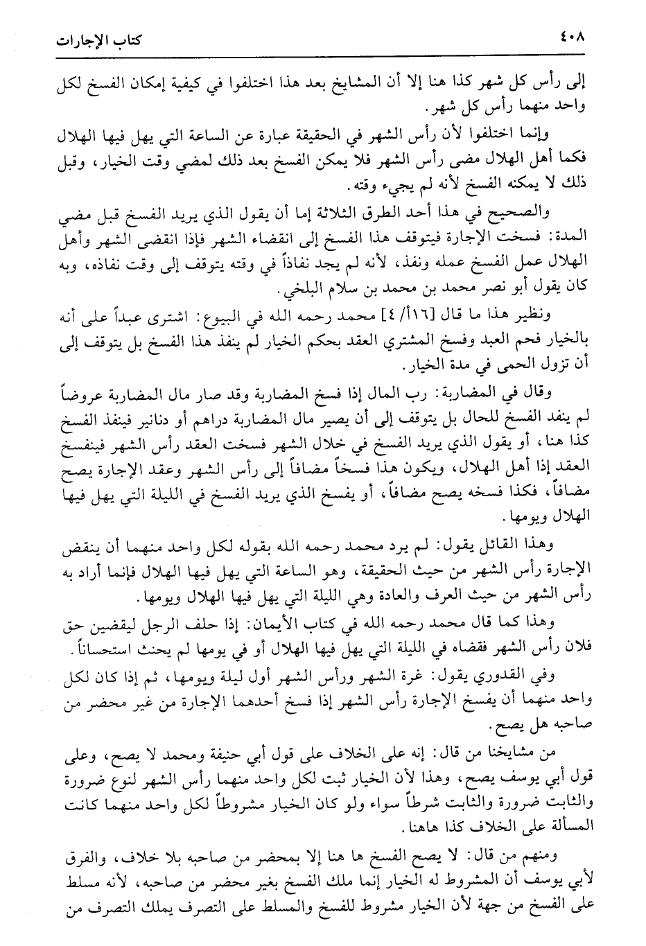 وهذا القائل يقول: لم يرد محمد رحمه الله بقوله لكل واحد منهما أن ينقض الإجارة رأس الشهر من حيث الحقيقة، وهو الساعة التي يهل فيها الهلال فإنما أراد به رأس الشهر من حيث العرف والعادة وهي الليلة التي يهل فيها الهلال ويومها.