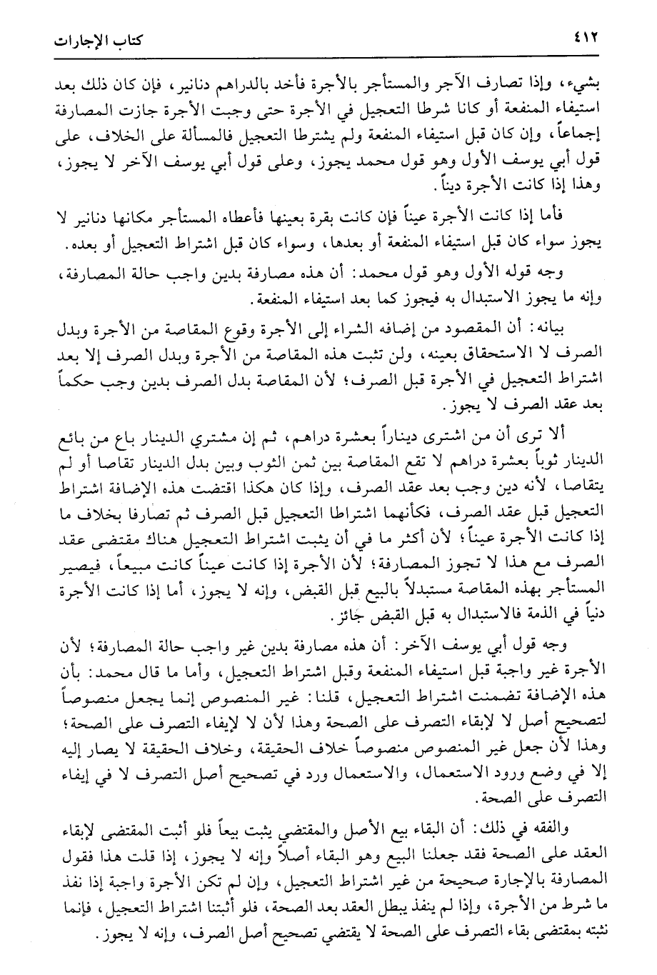 بشيء، وإذا تصارف الآجر والمستأجر بالأجرة فأخد بالدراهم دنانير، فإن كان ذلك بعد استيفاء المنفعة أو كانا شرطا التعجيل في الأجرة حتى وجبت الأجرة جازت المصارفة إجماعاً، وإن كان قبل استيفاء المنفعة ولم يشترطا التعجيل فالمسألة على الخلاف، على قول أبي يوسف الأول وهو قول محمد يجوز، وعلى قول أبي يوسف الآخر لا يجوز، وهذا إذا كانت الأجرة ديناً.