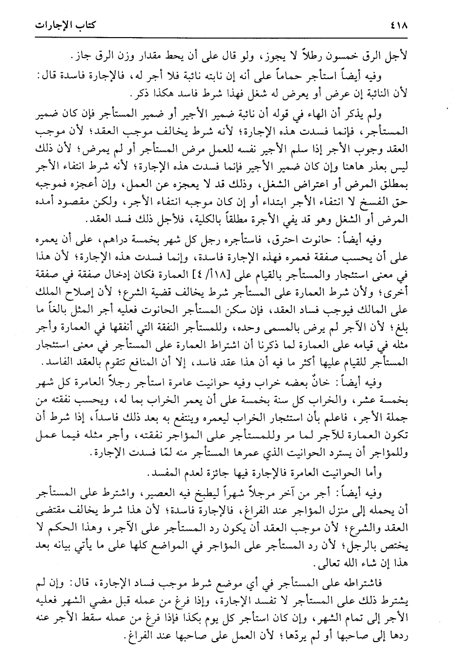 وفيه أيضاً: أجر من آخر مرجلاً شهراً ليطبخ فيه العصير، واشترط على المستأجر أن يحمله إلى منزل المؤاجر عند الفراغ، فالإجارة فاسدة؛ لأن هذا شرط يخالف مقتضى العقد والشرع؛ لأن موجب العقد أن يكون رد المستأجر على الآجر، وهذا الحكم لا يختص بالرجل؛ لأن رد المستأجر على المؤاجر في المواضع كلها على ما يأتي بيانه بعد هذا إن شاء الله تعالى.