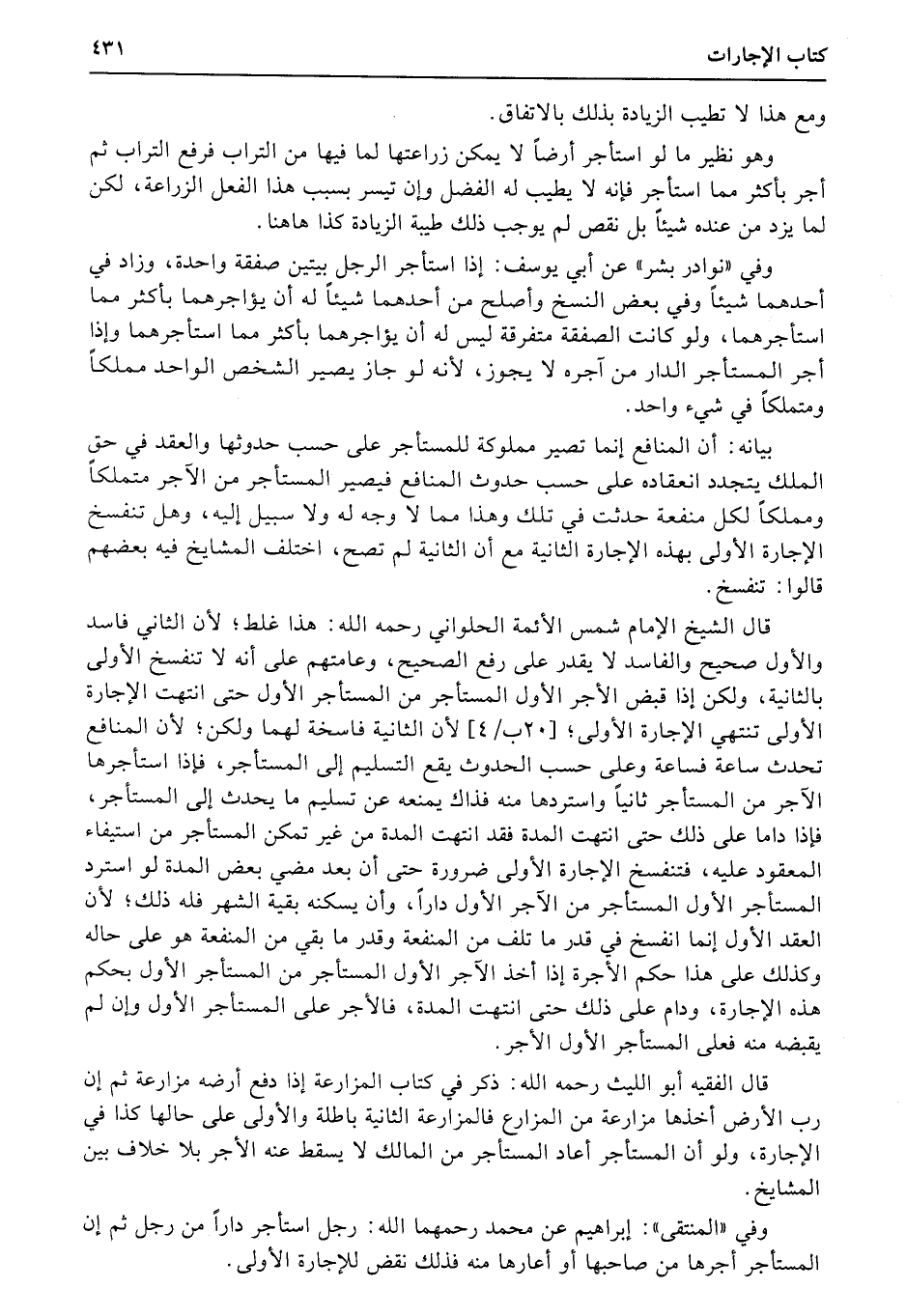بيانه: أن المنافع إنما تصير مملوكة للمستأجر على حسب حدوثها والعقد في حق الملك يتجدد انعقاده على حسب حدوث المنافع فيصير المستأجر من الآجر متملكاً ومملكاً لكل منفعة حدثت في تلك وهذا مما لا وجه له ولا سبيل إليه، وهل تنفسخ الإجارة الأولى بهذه الإجارة الثانية مع أن الثانية لم تصح، اختلف المشايخ فيه بعضهم قالوا: تنفسخ.