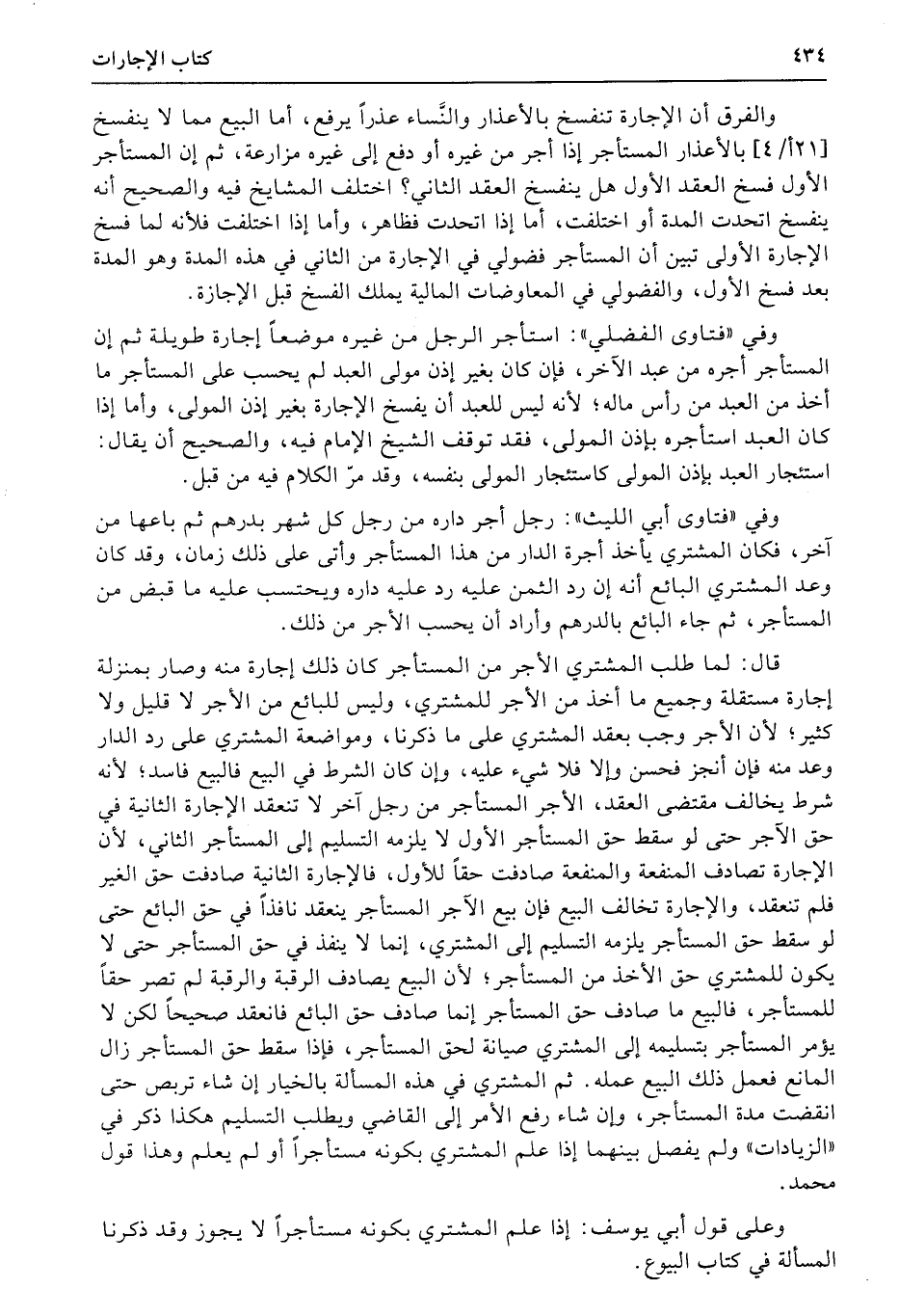 والفرق أن الإجارة تنفسخ بالأعذار والنَّساء عذراً يرفع، أما البيع مما لا ينفسخ (21أ4) بالأعذار المستأجر إذا أجر من غيره أو دفع إلى غيره مزارعة، ثم إن المستأجر الأول فسخ العقد الأول هل ينفسخ العقد الثاني؟ اختلف المشايخ فيه والصحيح أنه ينفسخ اتحدت المدة أو اختلفت، أما إذا اتحدت فظاهر، وأما إذا اختلفت فلأنه لما فسخ الإجارة الأولى تبين أن المستأجر فضولي في الإجارة من الثاني في هذه المدة وهو المدة بعد فسخ الأول، والفضولي في المعاوضات المالية يملك الفسخ قبل الإجازة.