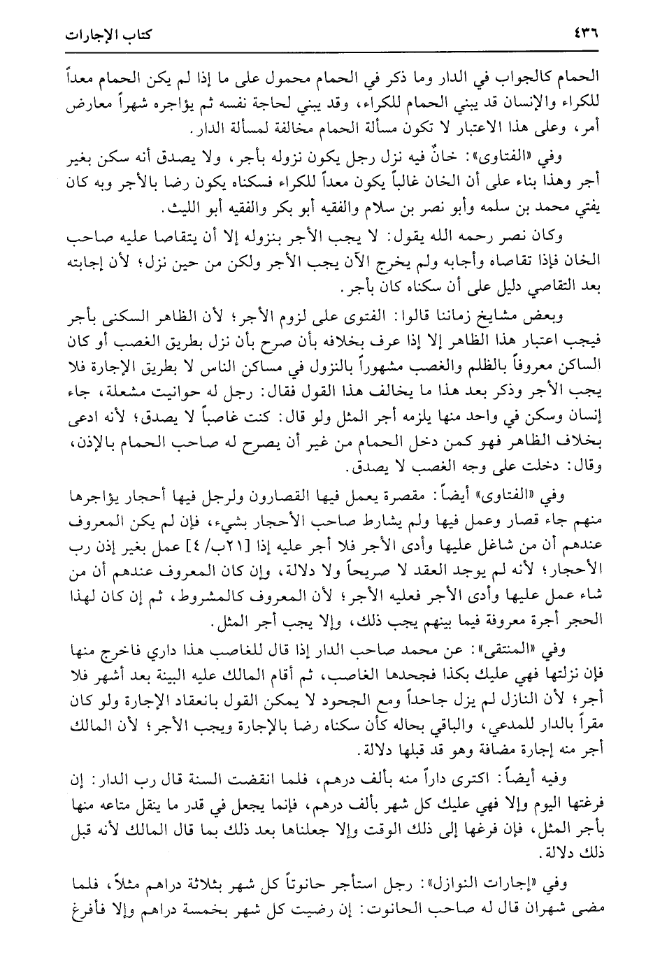 وكان نصر رحمه الله يقول: لا يجب الأجر بنزوله إلا أن يتقاصا عليه صاحب الخان فإذا تقاصاه وأجابه ولم يخرج الآن يجب الأجر ولكن من حين نزل؛ لأن إجابته بعد التقاصي دليل على أن سكناه كان بأجر.