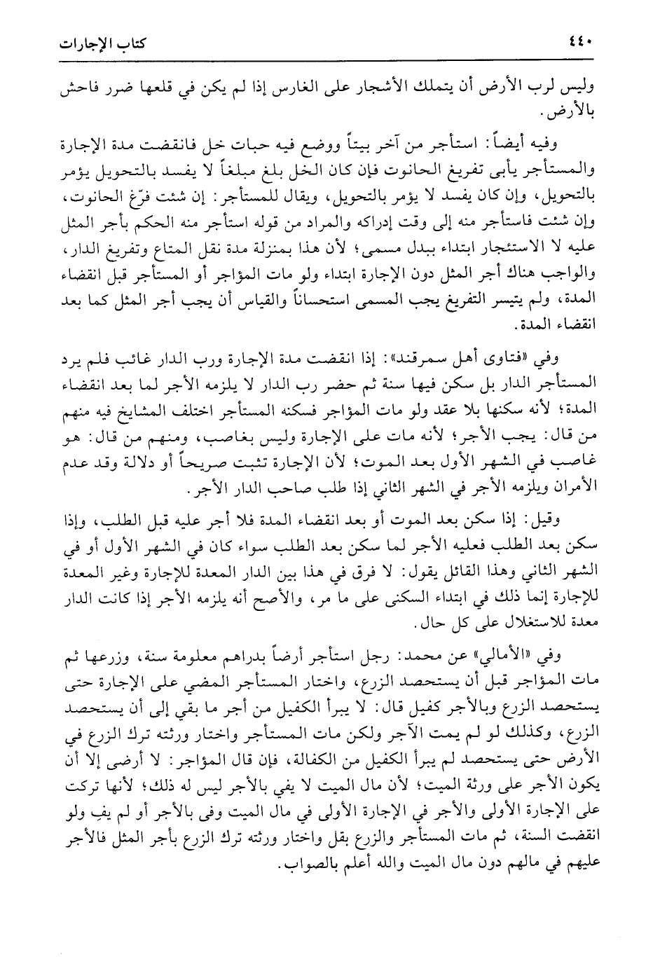 وفي «الأمالي» عن محمد: رجل استأجر أرضاً بدراهم معلومة سنة، وزرعها ثم مات المؤاجر قبل أن يستحصد الزرع، واختار المستأجر المضي على الإجارة حتى يستحصد الزرع وبالأجر كفيل قال: لا يبرأ الكفيل من أجر ما بقي إلى أن يستحصد الزرع، وكذلك لو لم يمت الآجر ولكن مات المستأجر واختار ورثته ترك الزرع في الأرض حتى يستحصد لم يبرأ الكفيل من الكفالة، فإن قال المؤاجر: لا أرضى إلا أن يكون الأجر على ورثة الميت؛ لأن مال الميت لا يفي بالأجر ليس له ذلك؛ لأنها تركت على الإجارة الأولى والأجر في الإجارة الأولى في مال الميت وفى بالأجر أو لم يفِ ولو انقضت السنة، ثم مات المستأجر والزرع بقل واختار ورثته ترك الزرع بأجر المثل فالأجر عليهم في مالهم دون مال الميت والله أعلم بالصواب.