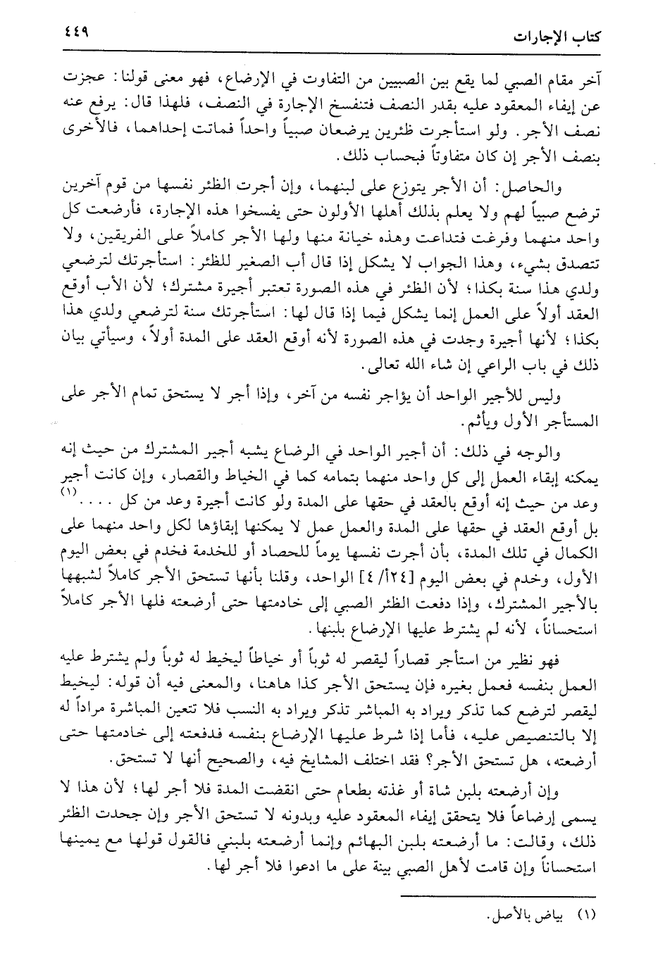 والوجه في ذلك: أن أجير الواحد في الرضاع يشبه أجير المشترك من حيث إنه يمكنه إبقاء العمل إلى كل واحد منهما بتمامه كما في الخياط والقصار، وإن كانت أجير وعد من حيث إنه أوقع بالعقد في حقها على المدة ولو كانت أجيرة وعد من كل.... بل أوقع العقد في حقها على المدة والعمل عمل لا يمكنها إبقاؤها لكل واحد منهما على الكمال في تلك المدة، بأن أجرت نفسها يوماً للحصاد أو للخدمة فخدم في بعض اليوم الأول، وخدم في بعض اليوم (24أ4) الوحد، وقلنا بأنها تستحق الأجر كاملاً لشبهها بالأجير المشترك، وإذا دفعت الظئر الصبي إلى خادمتها حتى أرضعته فلها الأجر كاملاً استحساناً، لأنه لم يشترط عليها الإرضاع بلبنها.