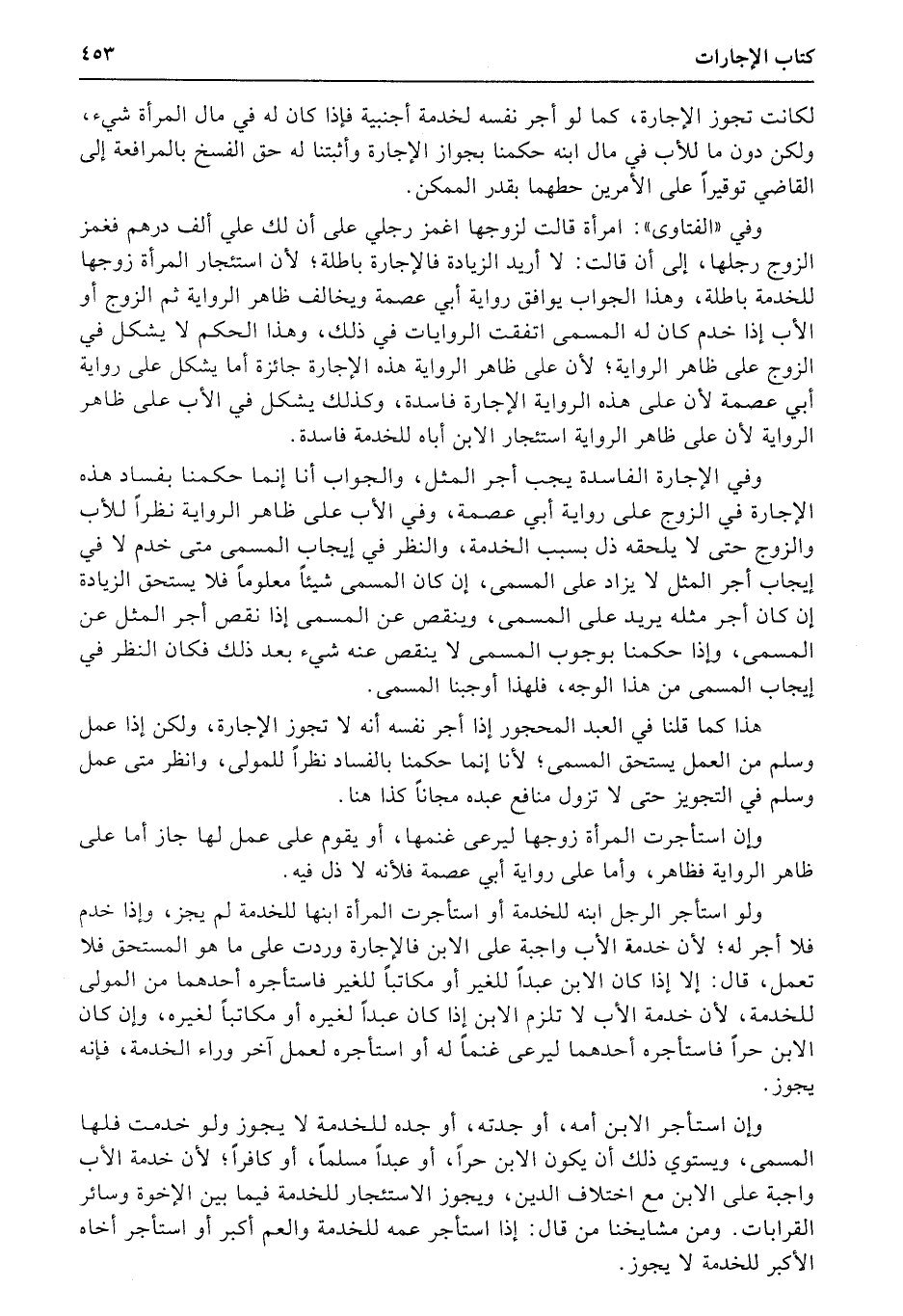 وإن استأجر الابن أمه، أو جدته، أو جده للخدمة لا يجوز ولو خدمت فلها المسمى، ويستوي ذلك أن يكون الابن حراً، أو عبداً مسلماً، أو كافراً؛ لأن خدمة الأب واجبة على الابن مع اختلاف الدين، ويجوز الاستئجار للخدمة فيما بين الأخوة وسائر القرابات. ومن مشايخنا من قال: إذا استأجر عمه للخدمة والعم أكبر أو استأجر أخاه الأكبر للخدمة لا يجوز.