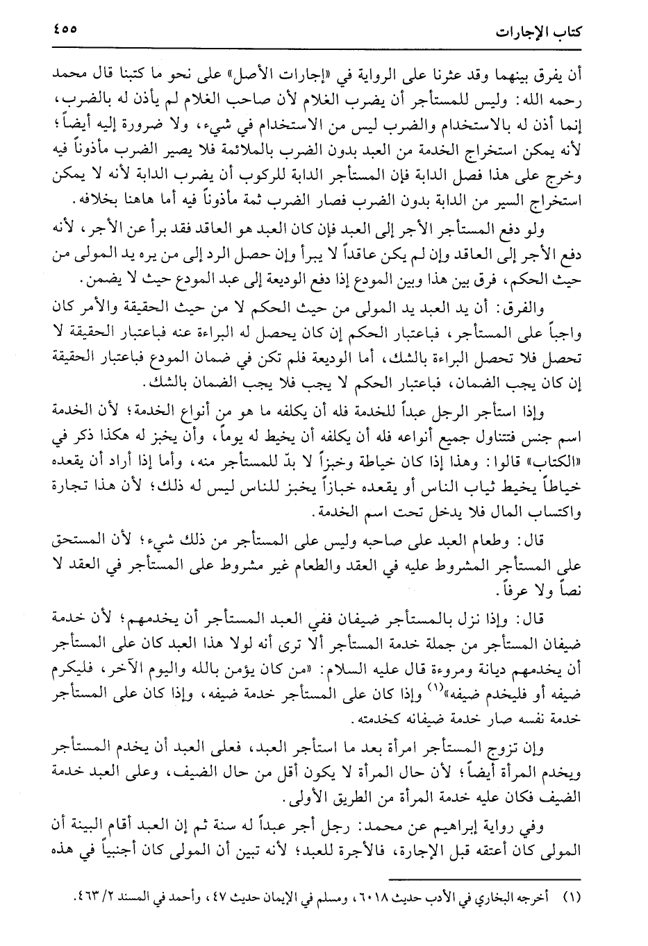 قال: وإذا نزل بالمستأجر ضيفان ففي العبد المستأجر أن يخدمهم؛ لأن خدمة ضيفان المستأجر من جملة خدمة المستأجر ألا ترى أنه لولا هذا العبد كان على المستأجر أن يخدمهم ديانة ومروءة قال عليه السلام: «من كان يؤمن بالله واليوم الآخر، فليكرم ضيفه أو فليخدم ضيفه» وإذا كان على المستأجر خدمة ضيفه، وإذا كان على المستأجر خدمة نفسه صار خدمة ضيفانه كخدمته.
