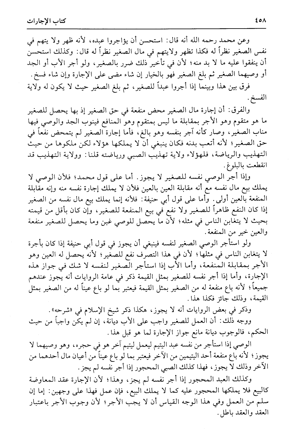 وعن محمد رحمه الله أنه قال: استحسن أن يؤاجروا عبده، لأنه ظهر ولا يتهم في نفس الصغير نظراً له فكذا تظهر ولايتهم في مال الصغير نظراً له قال: وكذلك استحسن أن ينفقوا عليه ما لا بد منه؛ لأن في تأخير ذلك ضرر بالصغير، ولو أجر الأب أو الجد أووصيهما الصغير ثم بلغ الصغير فهو بالخيار إن شاء مضى على الإجارة وإن شاء فسخ.