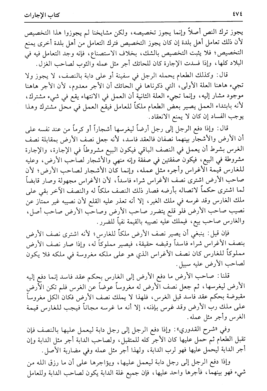 قال: وكذلك الطعام يحمله الرجل في سفينة أو على دابة بالنصف، لا يجوز ولا تجيء هاهنا العلة الأولى، التي ذكرناها في الحائك أن الأجر معدوم، لأن الأجر هاهنا موجود مشار إليه، وإنما تجيء العلة الثانية أن العمل في الانتهاء يقع في شيء مشترك، لأنه بابتداء العمل يصير بعض الطعام ملكاً للعامل فيقع العمل في محل مشترك وهذا يوجب الفساد إن كان لا يمنع الانعقاد.