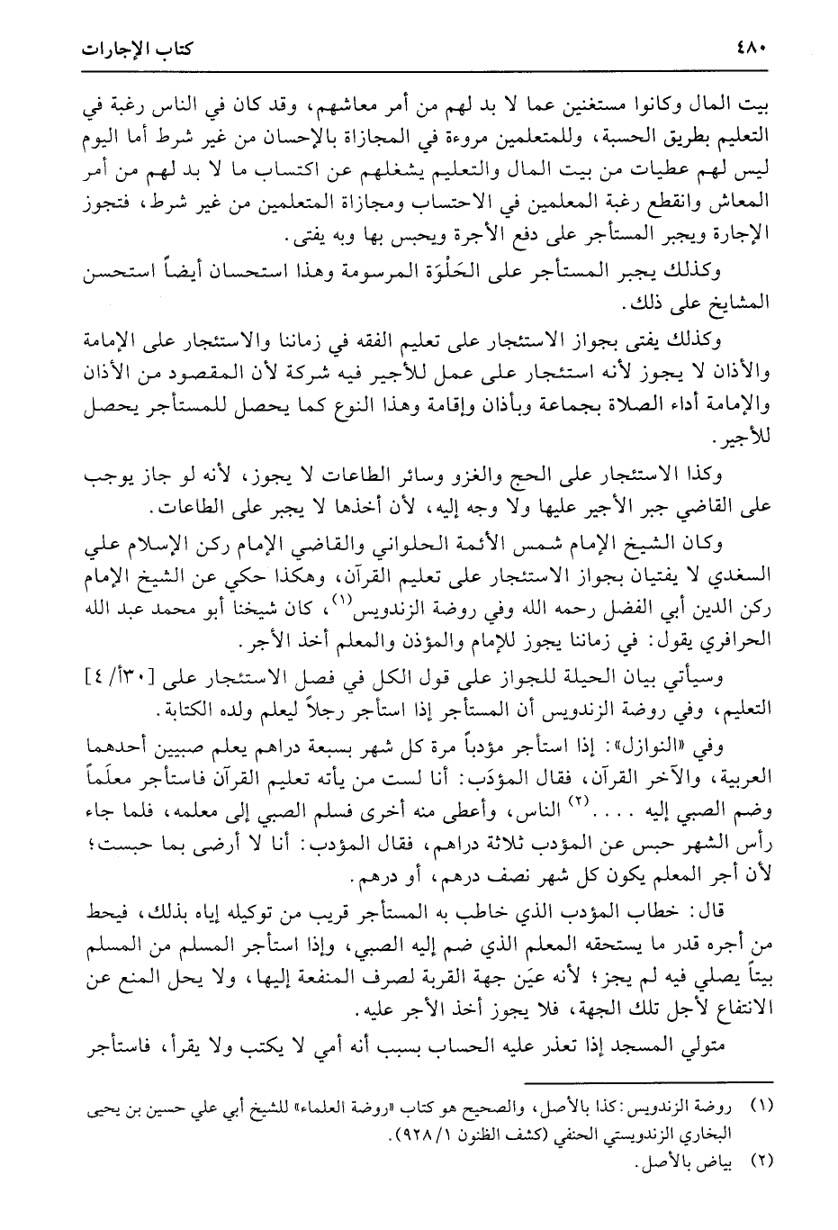 وكان الشيخ الإمام شمس الأئمة الحلواني والقاضي الإمام ركن الإسلام علي السغدي لا يفتيان بجواز الاستئجار على تعليم القرآن، وهكذا حكي عن الشيخ الإمام ركن الدين أبي الفضل رحمه الله وفي روضة الزندويس، كان شيخنا أبو محمد عبد الله الحرافري يقول: في زماننا يجوز للإمام والمؤذن والمعلم أخذ الأجر.