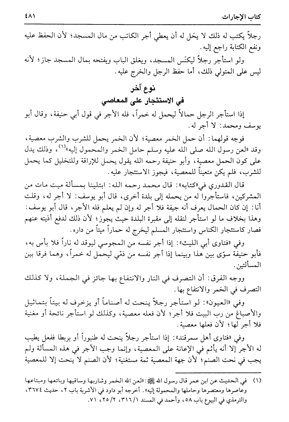 فوجه قولهما: أن حمل الخمر معصية؛ لأن الخمر يحمل للشرب والشرب معصية، وقد «لعن رسول الله صلى الله عليه وسلم حامل الخمر والمحمول إليه» ، وذلك يدل على كون الحمل معصية، وأبو حنيفة رحمه الله يقول يحمل للإراقة وللتخليل كما يحمل للشرب، فلم يكن متعيناً للمعصية، فيجوز الاستئجار عليه.