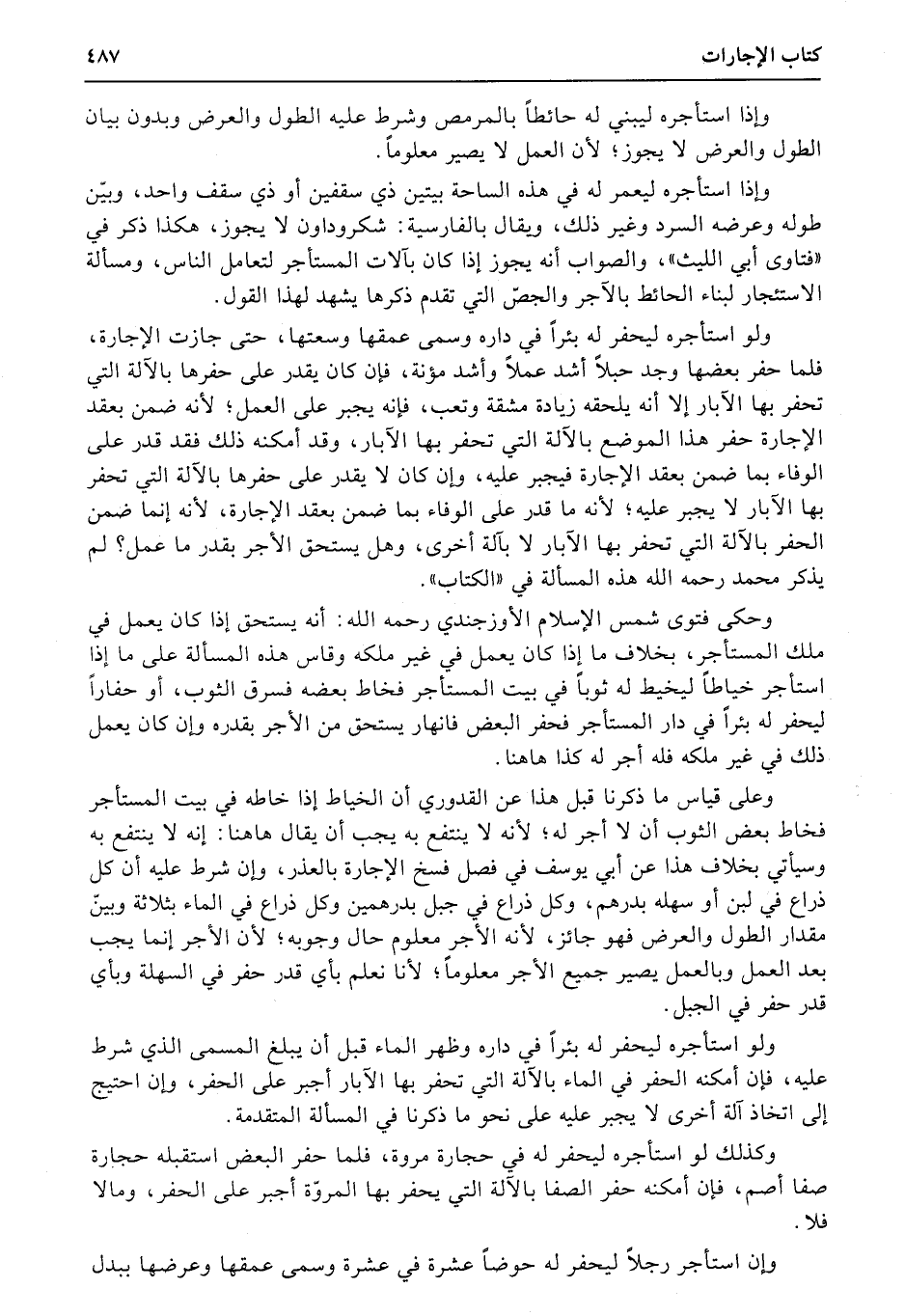 ولو استأجره ليحفر له بئراً في داره وسمى عمقها وسعتها، حتى جازت الإجارة، فلما حفر بعضها وجد حبلاً أشد عملاً وأشد مؤنة، فإن كان يقدر على حفرها بالآلة التي تحفر بها الآبار إلا أنه يلحقه زيادة مشقة وتعب، فإنه يجبر على العمل؛ لأنه ضمن بعقد الإجارة حفر هذا الموضع بالآلة التي تحفر بها الآبار، وقد أمكنه ذلك فقد قدر على الوفاء بما ضمن بعقد الإجارة فيجبر عليه، وإن كان لا يقدر على حفرها بالآلة التي تحفر بها الآبار لا يجبر عليه؛ لأنه ما قدر على الوفاء بما ضمن بعقد الإجارة، لأنه إنما ضمن الحفر بالآلة التي تحفر بها الآبار لا بآلة أخرى، وهل يستحق الأجر بقدر ما عمل؟ لم يذكر محمد رحمه الله هذه المسألة في «الكتاب» .