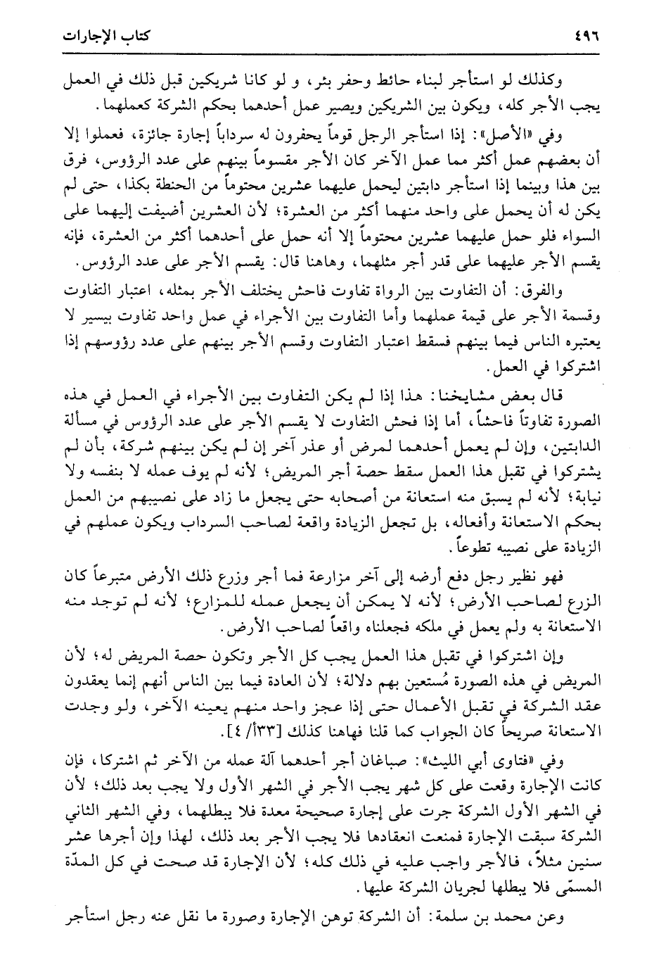 قال بعض مشايخنا: هذا إذا لم يكن التفاوت بين الأجراء في العمل في هذه الصورة تفاوتاً فاحشاً، أما إذا فحش التفاوت لا يقسم الأجر على عدد الرؤوس في مسألة الدابتين، وإن لم يعمل أحدهما لمرض أو عذر آخر إن لم يكن بينهم شركة، بأن لم يشتركوا في تقبل هذا العمل سقط حصة أجر المريض؛ لأنه لم يوف عمله لا بنفسه ولا نيابة؛ لأنه لم يسبق منه استعانة من أصحابه حتى يجعل ما زاد على نصيبهم من العمل بحكم الاستعانة وأفعاله، بل تجعل الزيادة واقعة لصاحب السرداب ويكون عملهم في الزيادة على نصيبه تطوعاً.