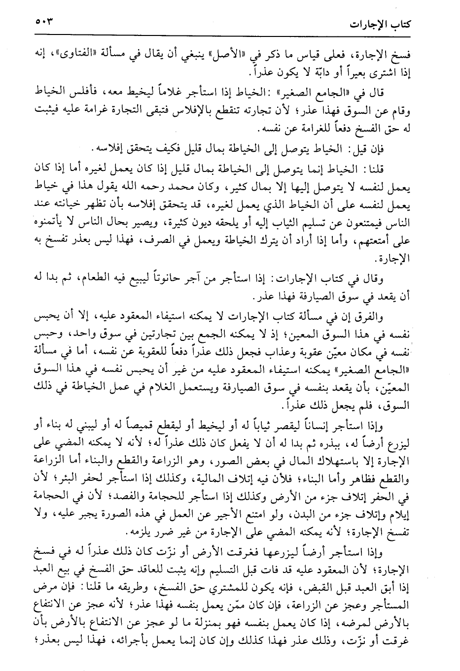 والفرق إن في مسألة كتاب الإجارات لا يمكنه استيفاء المعقود عليه، إلا أن يحبس نفسه في هذا السوق المعين؛ إذ لا يمكنه الجمع بين تجاريين في سوق واحد، وحبس نفسه في مكان معيّن عقوبة وعذاب فجعل ذلك عذراً دفعاً للعقوبة عن نفسه، أما في مسألة «الجامع الصغير» يمكنه استيفاء المعقود عليه من غير أن يحبس نفسه في هذا السوق المعيّن، بأن يقعد بنفسه في سوق الصيارفة ويستعمل الغلام في عمل الخياطة في ذلك السوق، فلم يجعل ذلك عذراً.