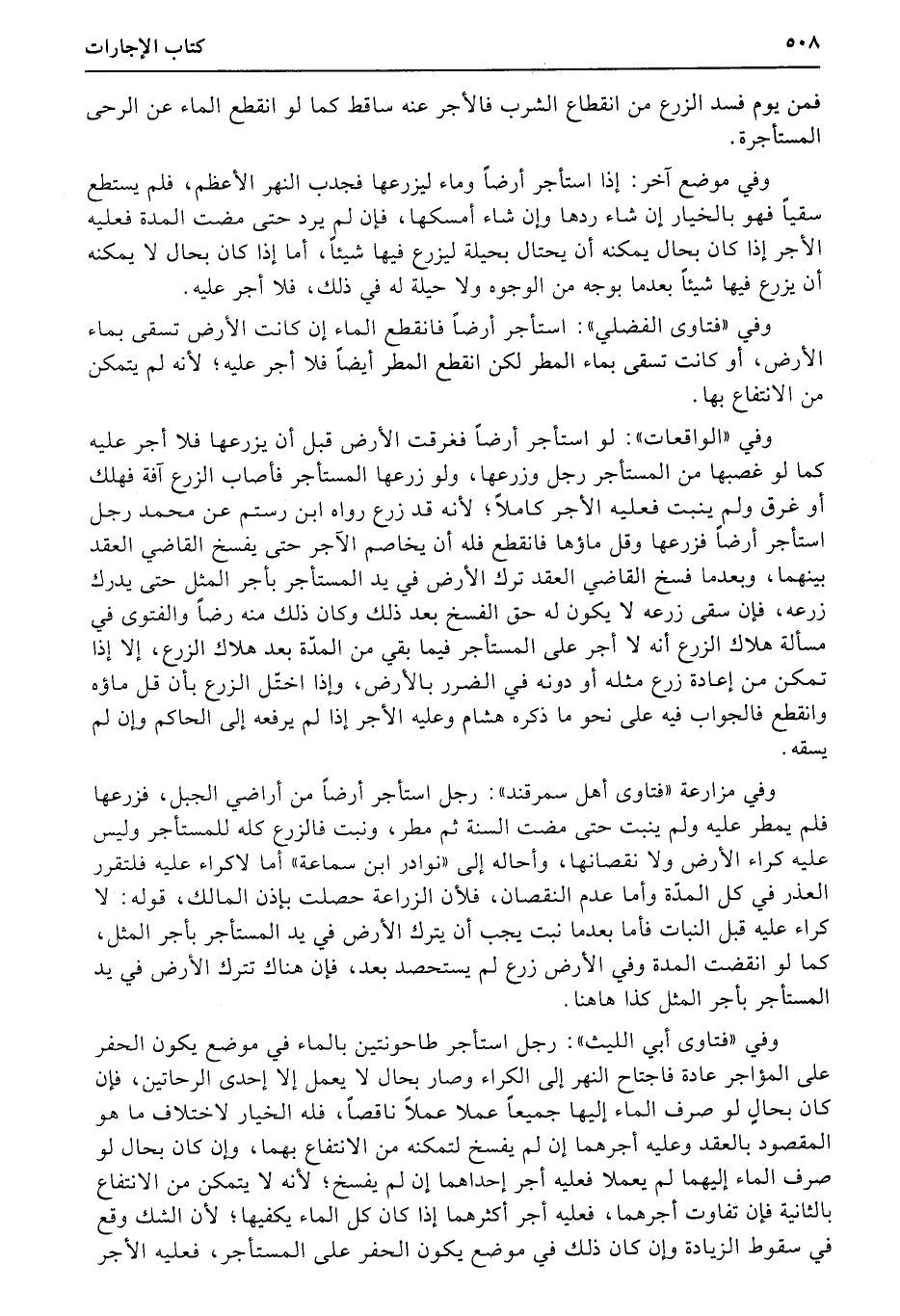 وفي «الواقعات» : لو استأجر أرضاً فغرقت الأرض قبل أن يزرعها فلا أجر عليه كما لو غصبها من المستأجر رجل وزرعها، ولو زرعها المستأجر فأصاب الزرع آفة فهلك أو غرق ولم ينبت فعليه الأجر كاملاً؛ لأنه قد زرع رواه ابن رستم عن محمد رجل استأجر أرضاً فزرعها وقل ماؤها فانقطع فله أن يخاصم الآجر حتى يفسخ القاضي العقد بينهما، وبعدما فسخ القاضي العقد ترك الأرض في يد المستأجر بأجر المثل حتى يدرك زرعه، فإن سقى زرعه لا يكون له حق الفسخ بعد ذلك وكان ذلك منه رضاً والفتوى في مسألة هلاك الزرع أنه لا أجر على المستأجر فيما بقي من المدّة بعد هلاك الزرع، إلا إذا تمكن من إعادة زرع مثله أو دونه في الضرر بالأرض، وإذا اختّل الزرع بأن قل ماؤه وانقطع فالجواب فيه على نحو ما ذكره هشام وعليه الأجر إذا لم يرفعه إلى الحاكم وإن لم يسقه.